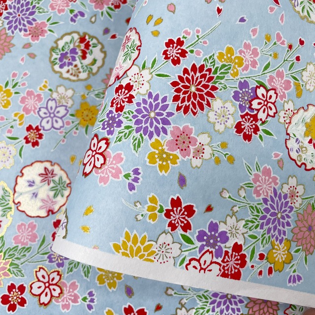 友禅和紙 華やか桜と菊 花模様の雪輪 水色地 大判 約63x93cm 千代紙 YUZEN dyeing 122718582