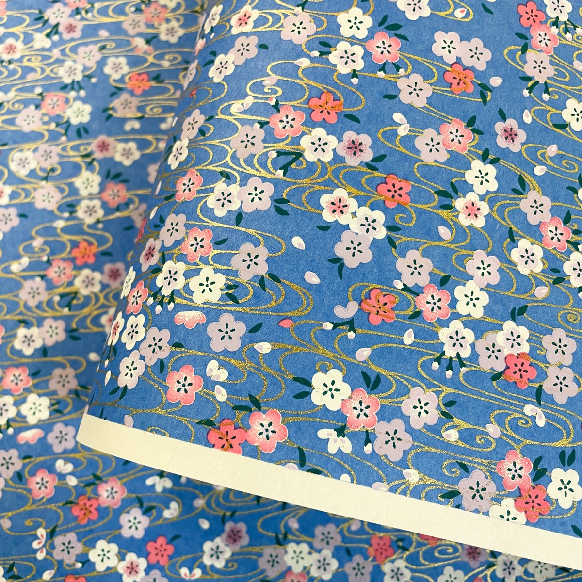 友禅和紙 可愛い梅と流水紋 青 水色 大判 約63x95cm 千代紙 YUZEN dyeing