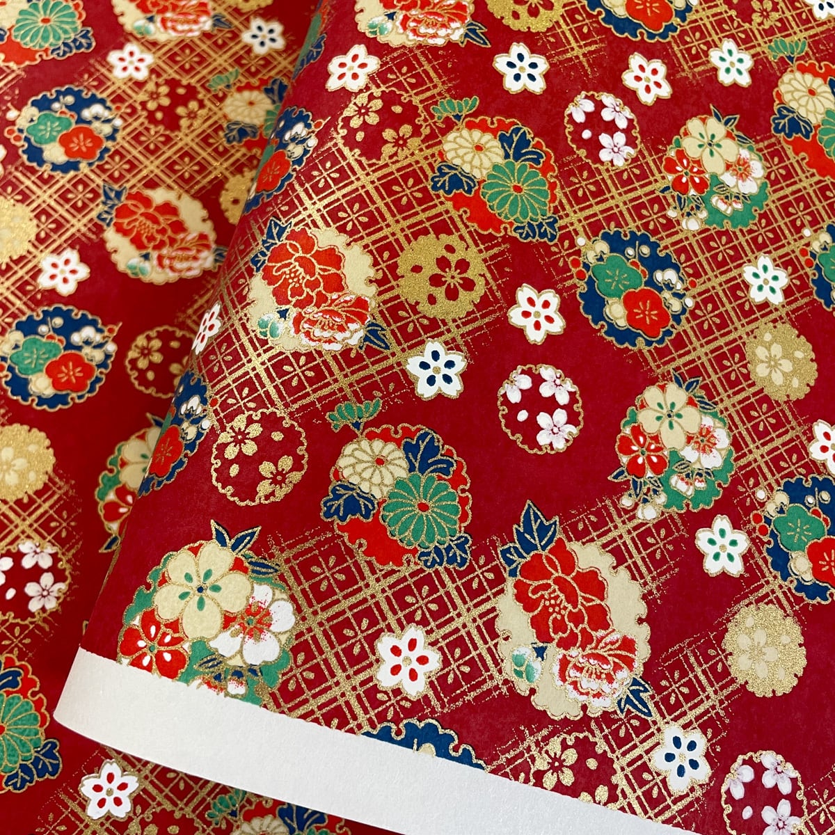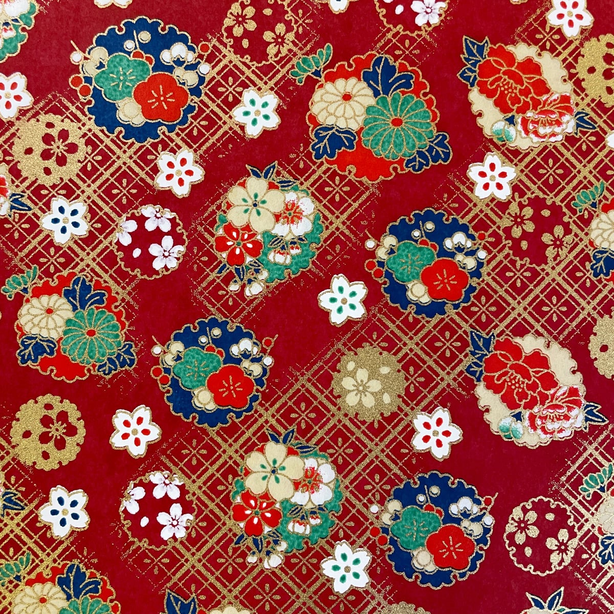 華やかな友禅和紙 花入り菱格子に雪輪紋 菊 牡丹 梅 紅赤 大判 約63x95cm 千代紙 YUZEN dyeing