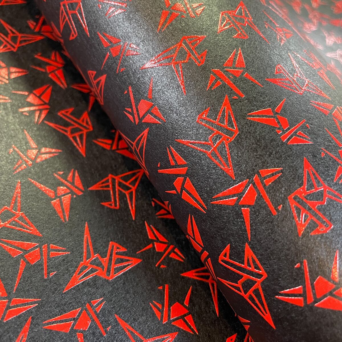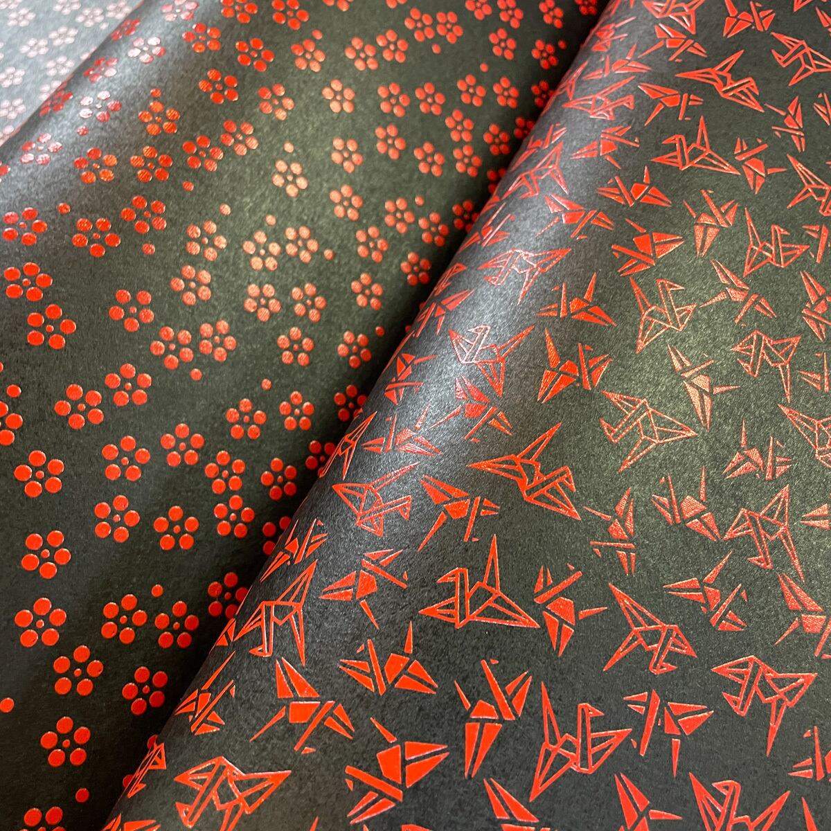 光沢のある黒地に、発泡加工された赤い柄が少しぷっくりした立体感のある豪華な和紙です。