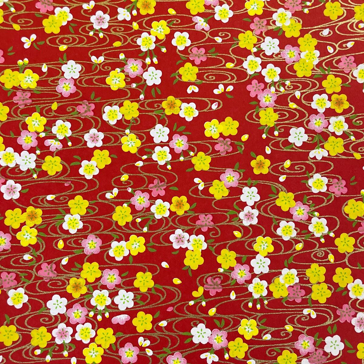 友禅和紙 可愛い梅と流水紋 赤 黄色とピンクの梅 大判 約63x95cm 千代紙 Yuzen Dyeing 102667015