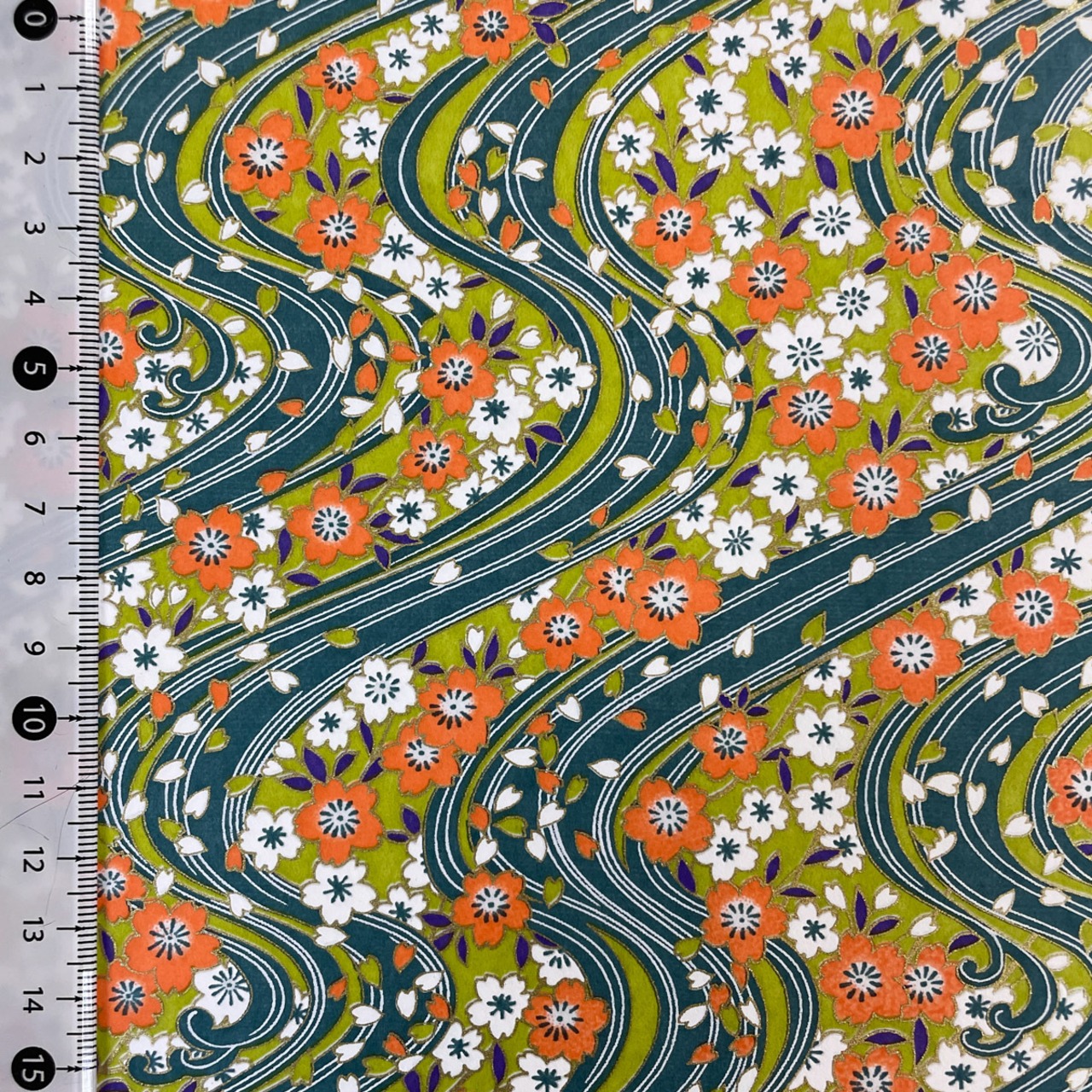 華やかな友禅紙 豪華 水の流れに桜 緑 オレンジ 大判 約63x95cm 千代紙 YUZEN dyeing