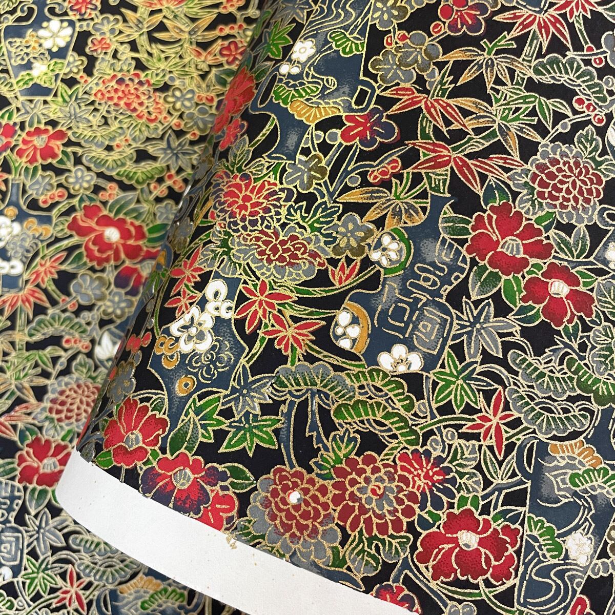 友禅和紙 華やか 花器と花々 椿 牡丹 松竹梅 黒地 大判 約63x93cm 千代紙 Yuzen Dyeing
