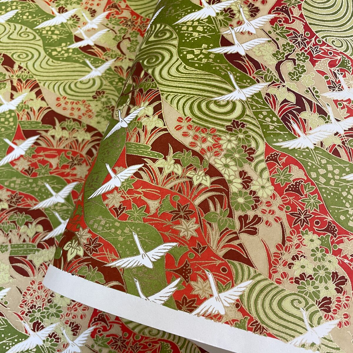 友禅和紙 切り継ぎ模様に飛び立つ鶴 梅 菊 紅葉 菖蒲 緑 赤 大判 約63x93cm 千代紙 Yuzen Dyeing