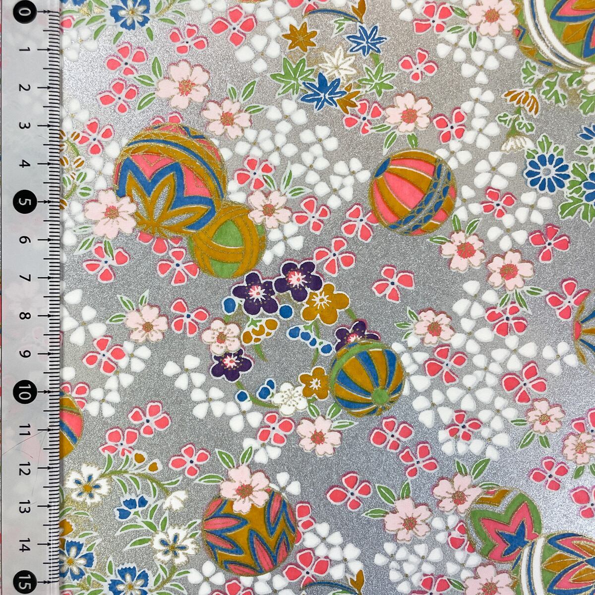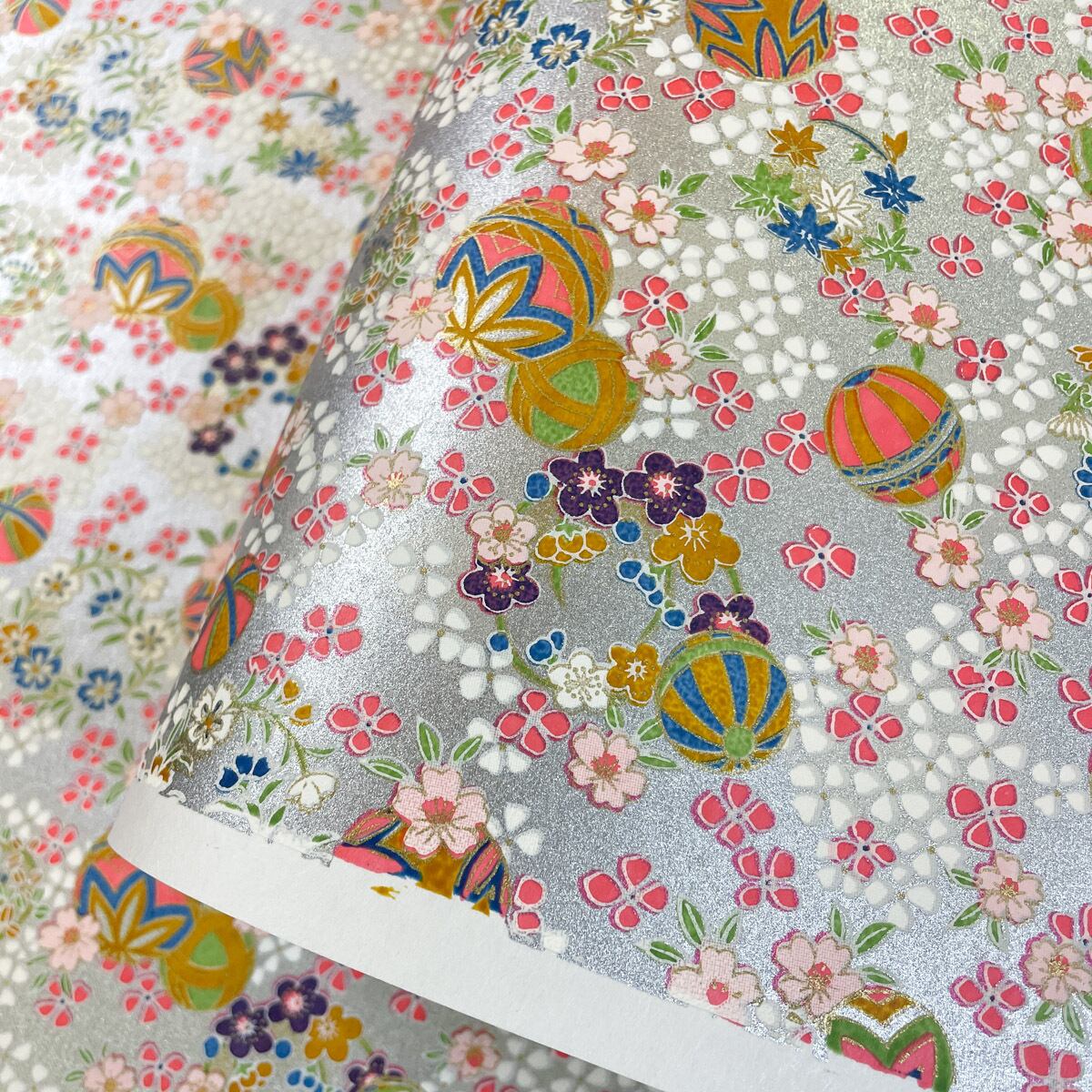 友禅和紙 発泡 華やか銀色地に毬と白の小花 シルバー 大判 約63x93cm 千代紙 YUZEN dyeing 107957093