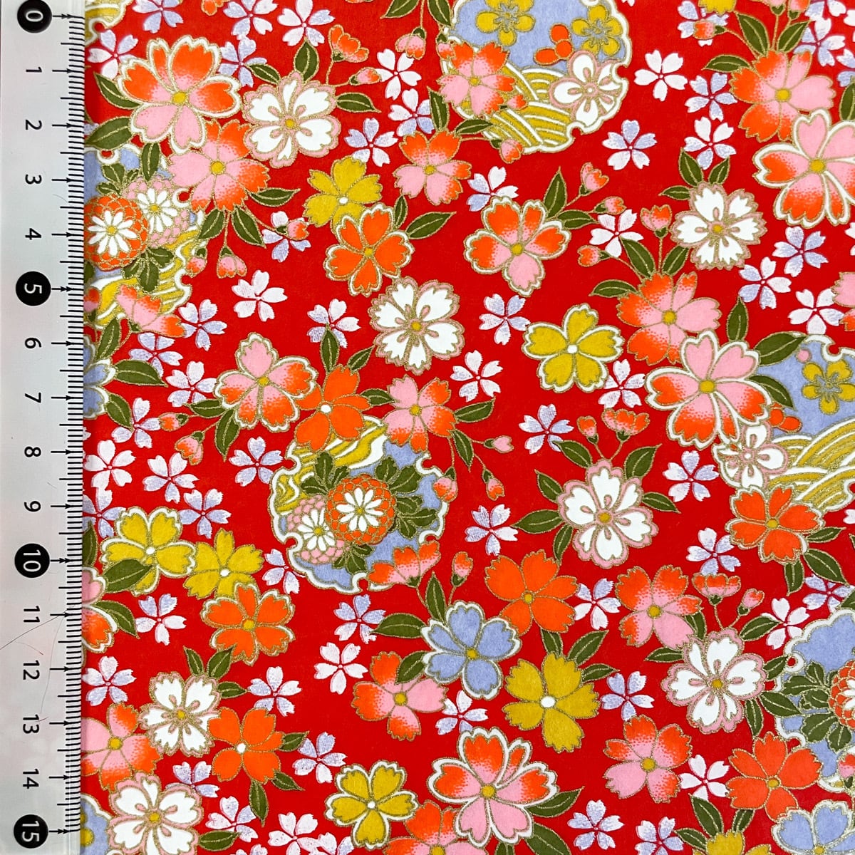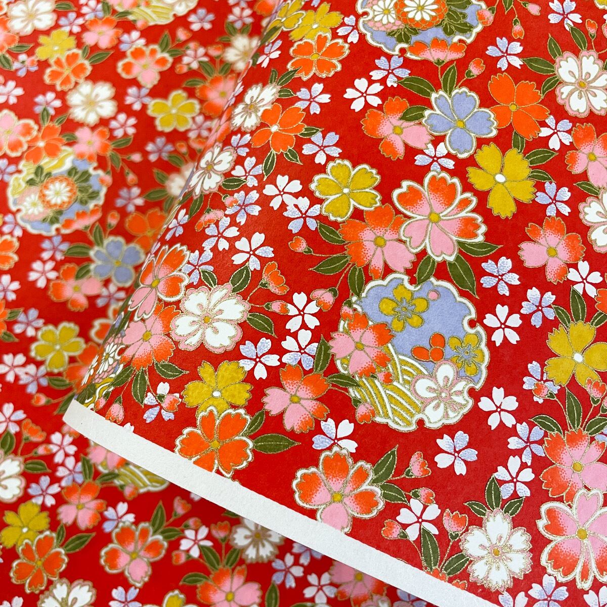 友禅和紙 華やか 桜と雪輪 小花 赤 大判 菊判 約63x93cm 千代紙 Yuzen Dyeing 109077441