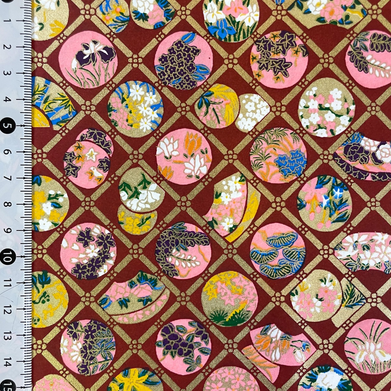 友禅和紙 天井絵風 斜め格子に季節の花々の丸紋様 臙脂色 紅赤色 大判 約63x93cm 千代紙 Yuzen Dyeing 113615648