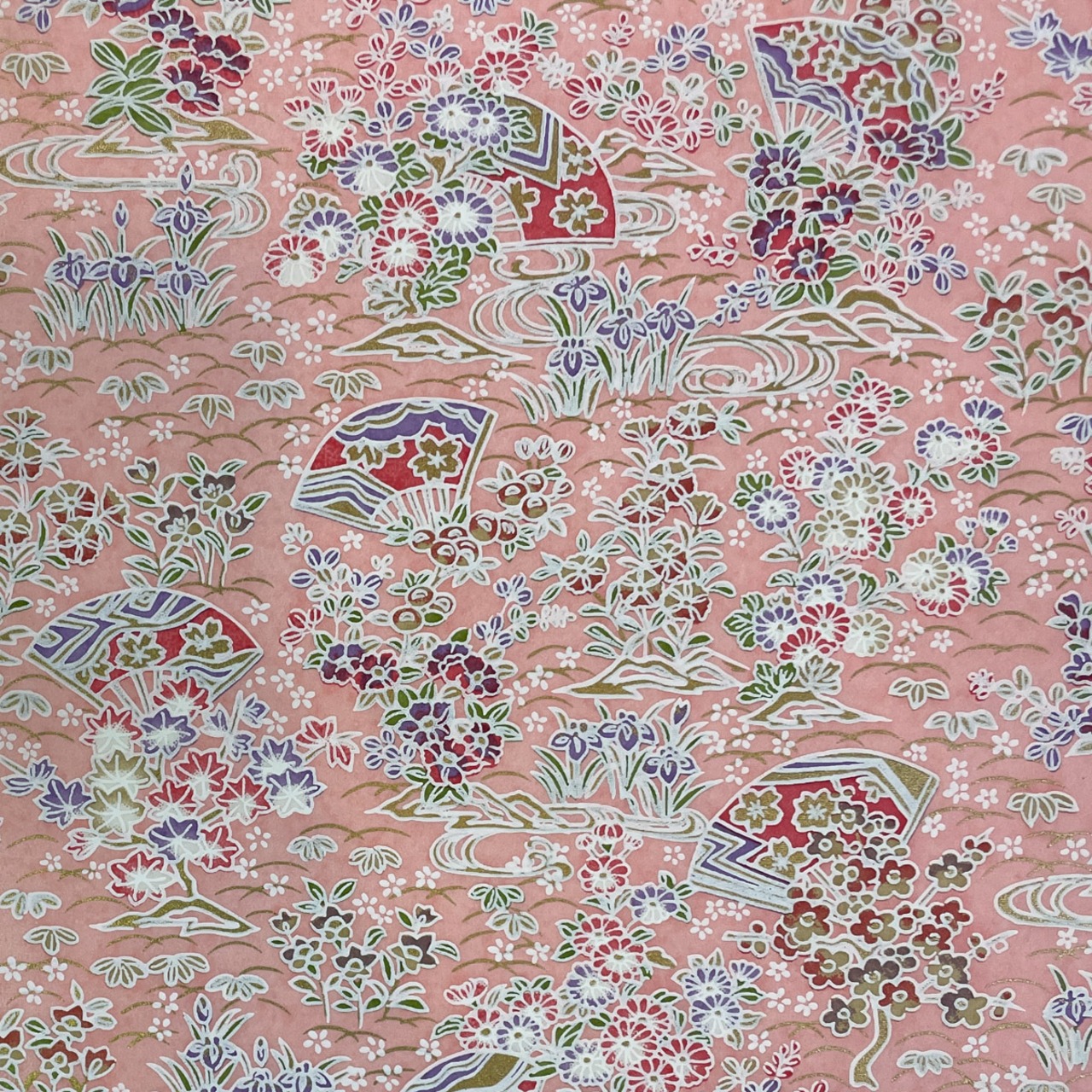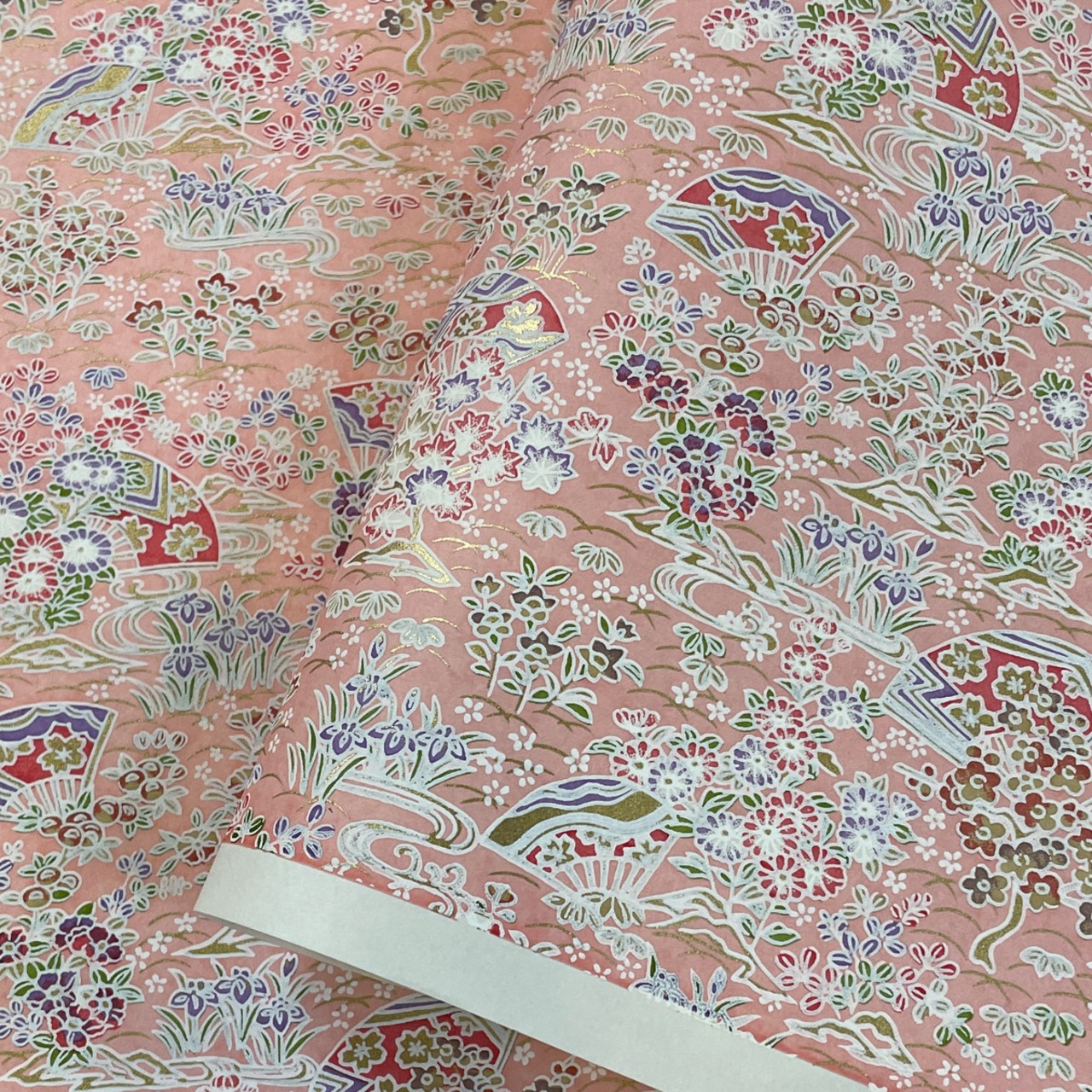 友禅和紙 優しいピンクに扇と季節の花々 大判 約63x93cm 千代紙 Yuzen Dyeing 113615954