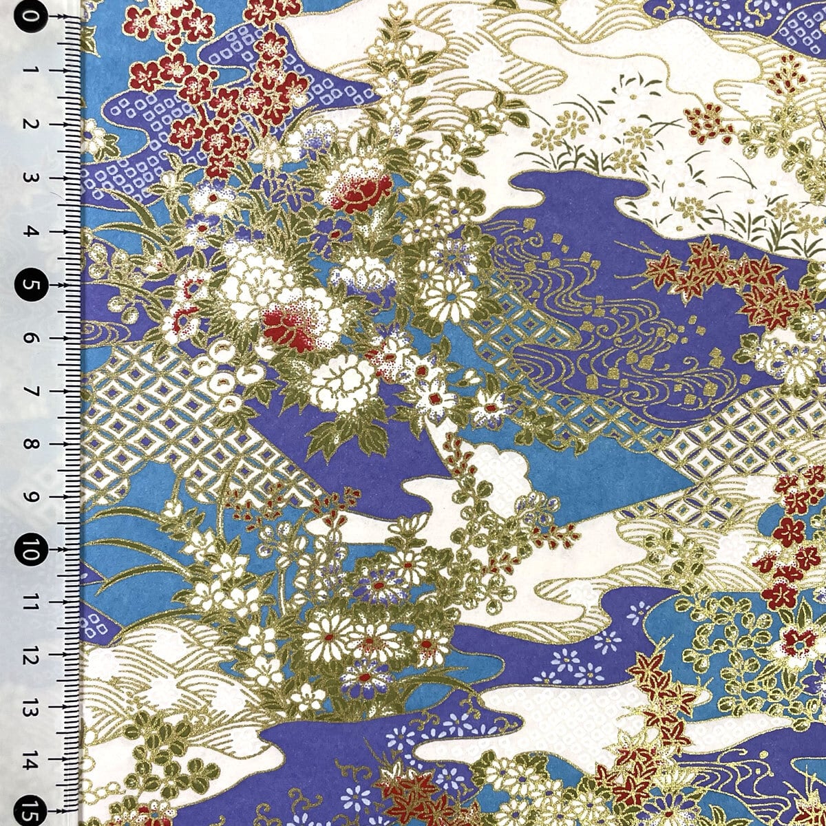 友禅和紙 華やかな古典柄 小花 草花 菊 波と七宝 青系 大判 約63x95cm 千代紙 YUZEN dyeing 114336697