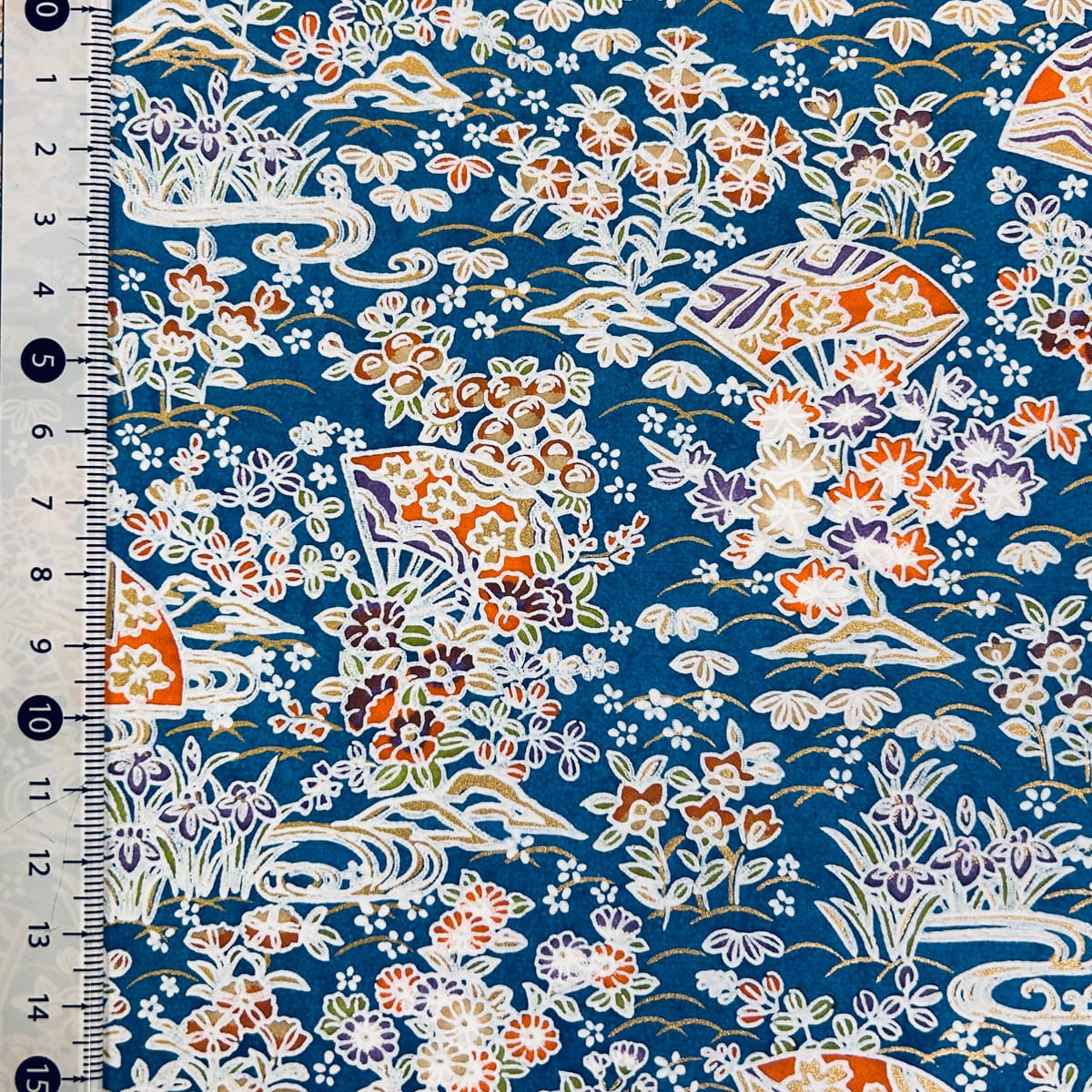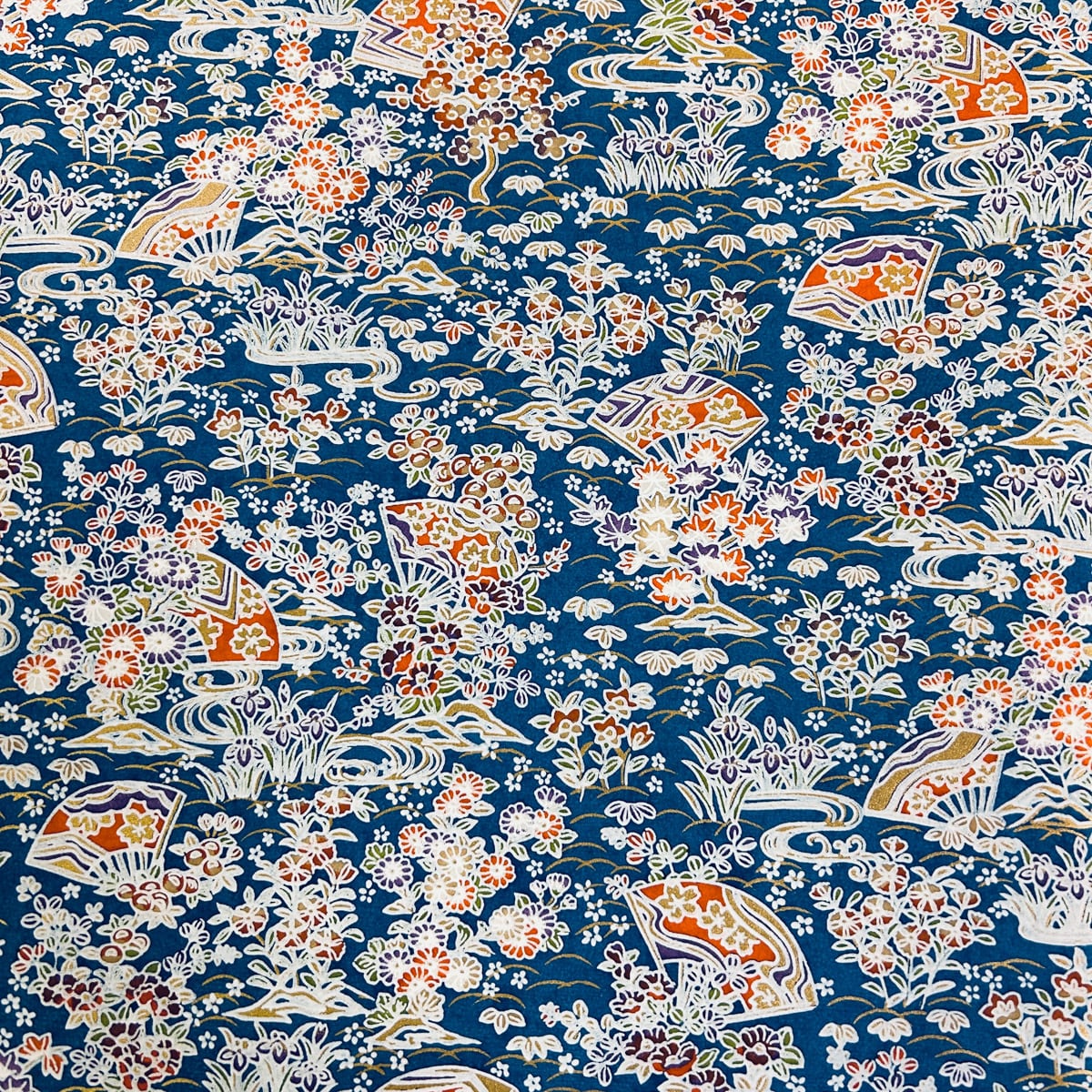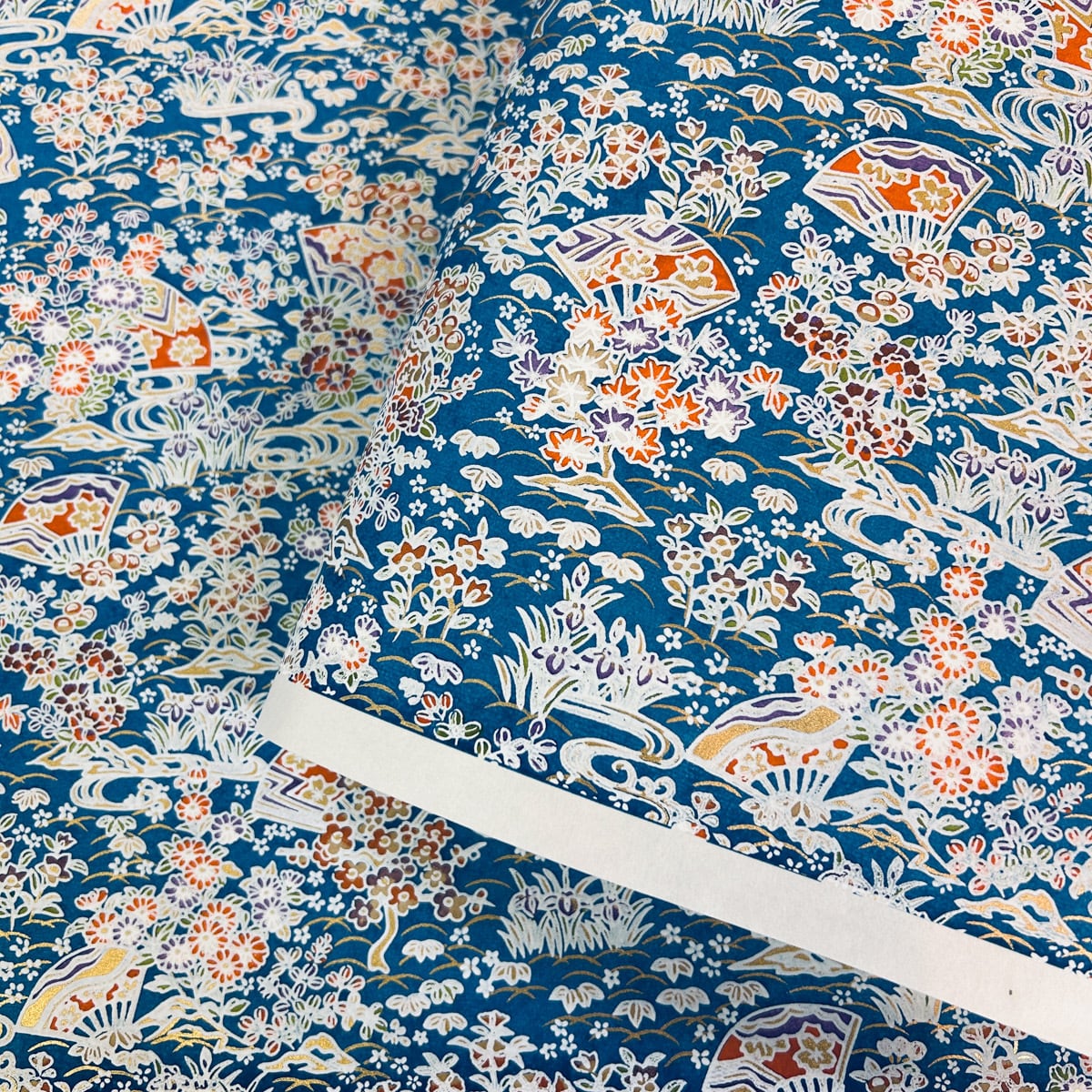友禅和紙 小さな扇と季節の花々 青と白 大判 約63x93cm 千代紙 YUZEN dyeing 117803974