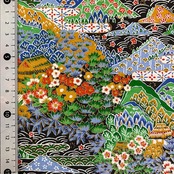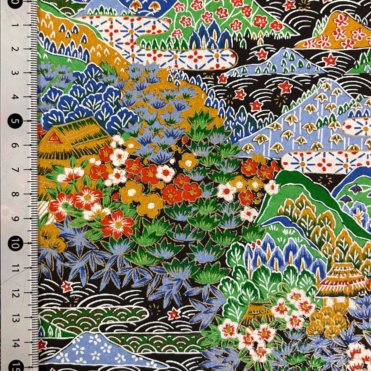友禅和紙 色彩豊かな山村の風景 黒地 大判 約63x93cm 千代紙 YUZEN dyeing 117804010