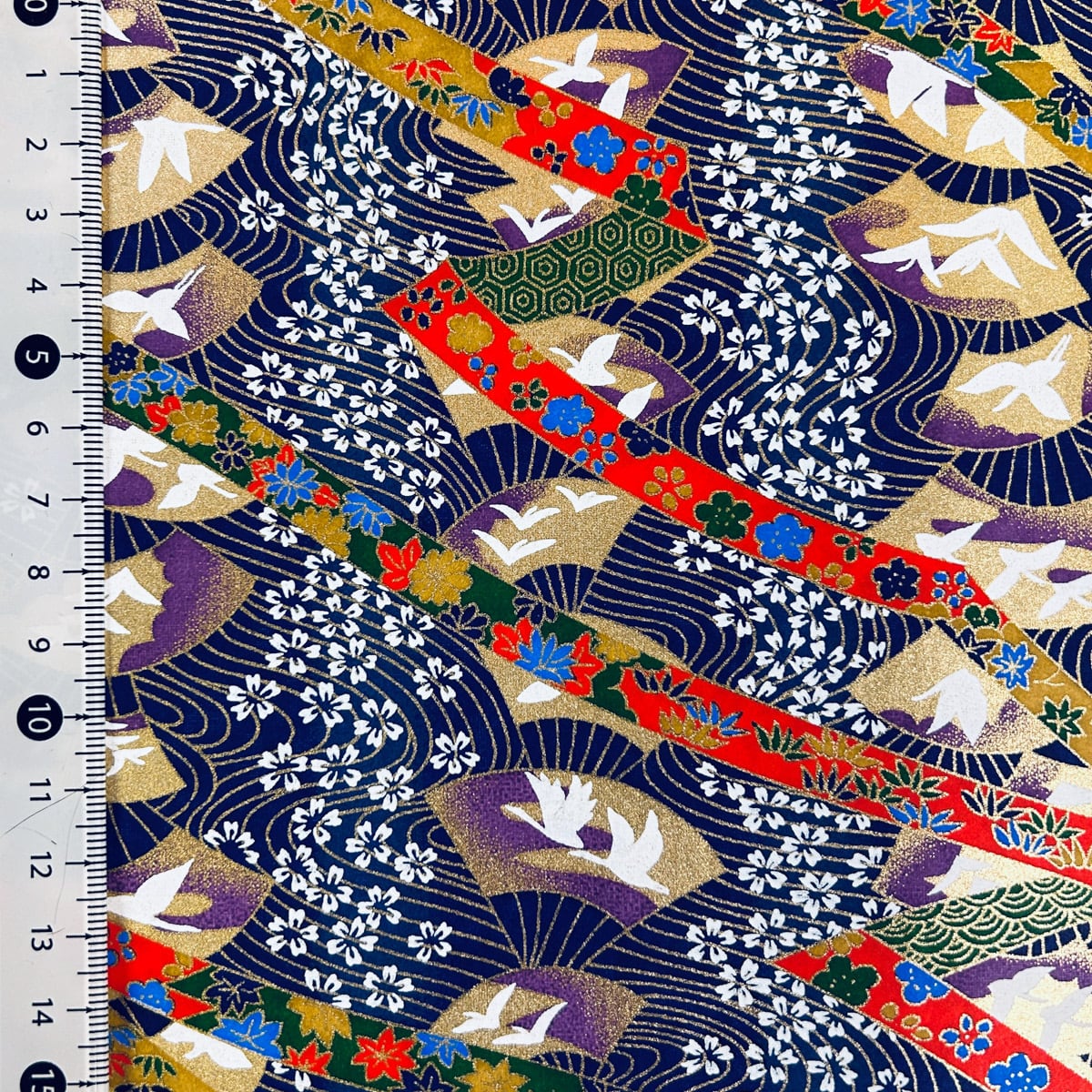 華やかな友禅和紙 扇と短冊 波に小花 紺地 青 大判 約63x93cm 千代紙 YUZEN dyeing 117804050