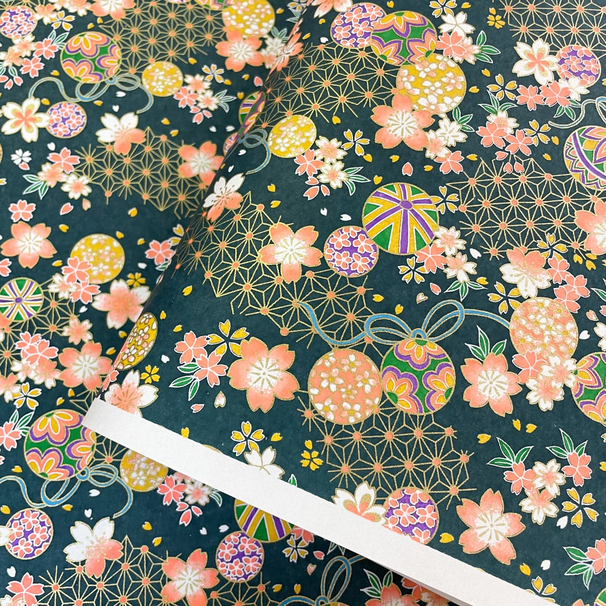 華やかな友禅紙 桜と毬 麻の葉紋様 深緑 大判 約63x93cm 千代紙 YUZEN dyeing 118306802