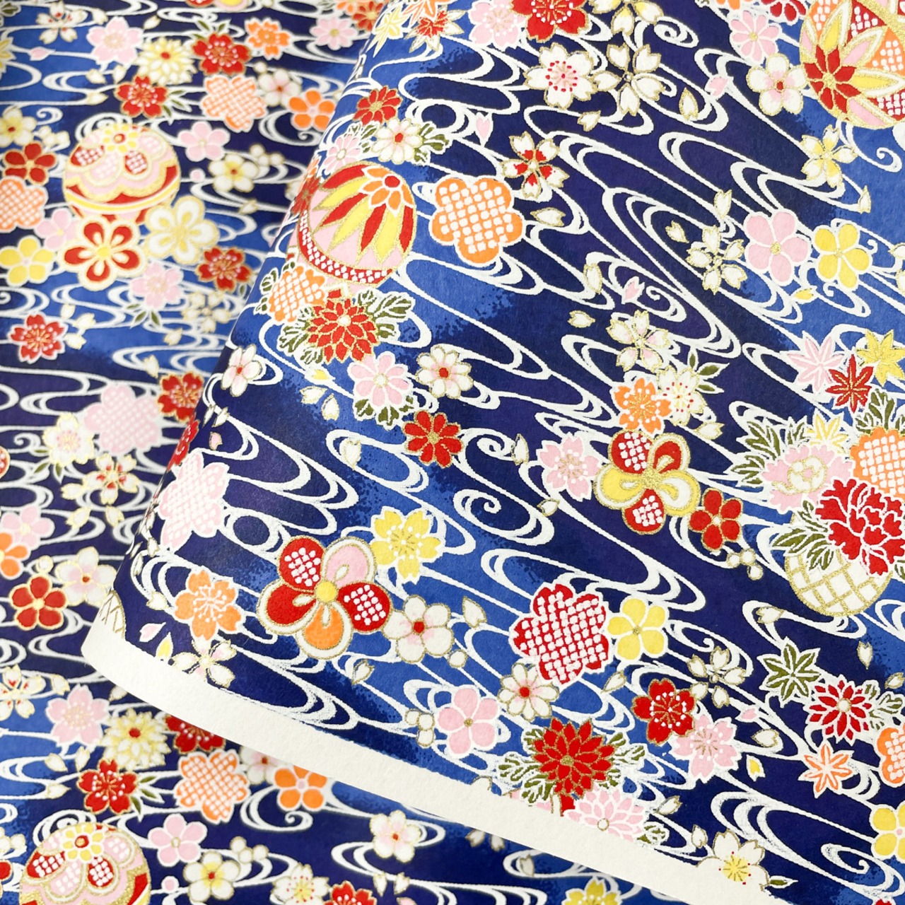 友禅和紙 華やか 煌めく水面に桜と花々 毬 赤 青 紺 大判 約63x93cm 千代紙 Yuzen dyeing 119087842