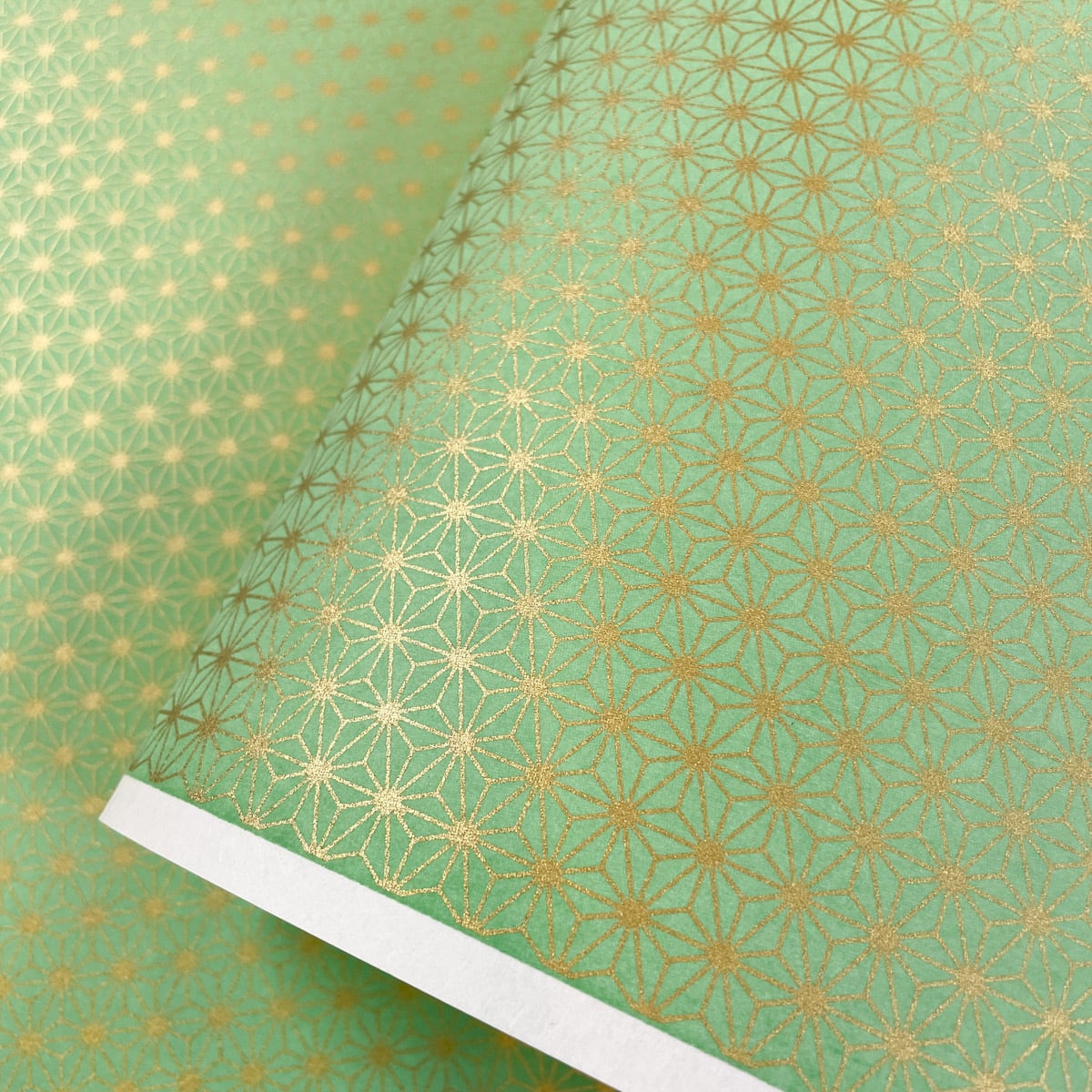 金色が華やかな加賀友禅 和紙 麻の葉 淡い緑 黄緑 大判 約63x93cm KAGA YUZEN Dyeing