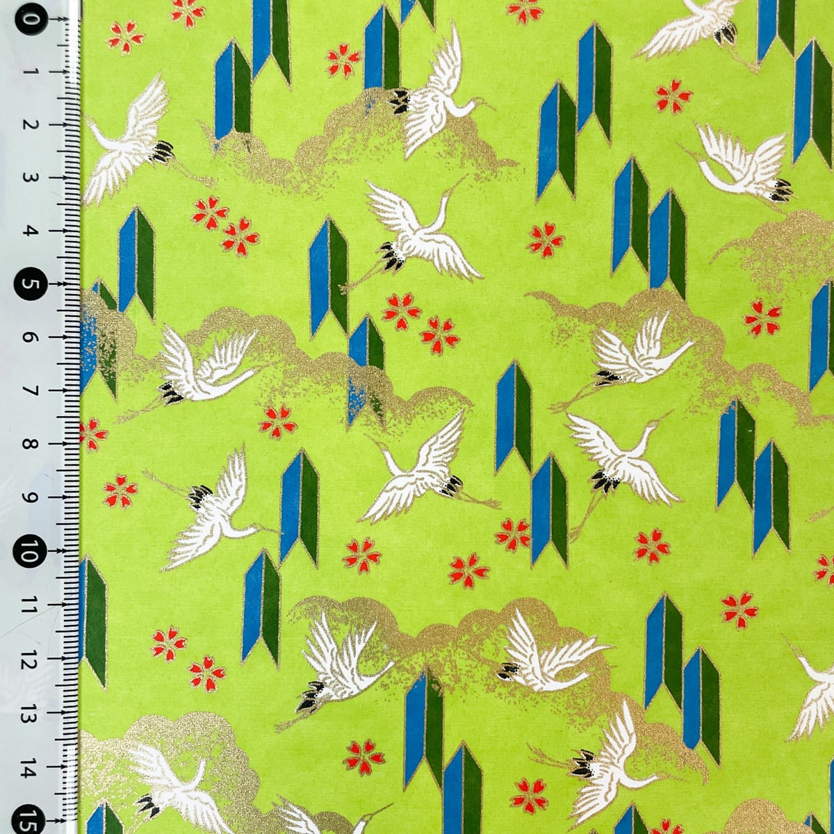 友禅和紙 明るい黄緑色地に鶴 金雲 青の矢絣 大判 約63x93cm 千代紙 YUZEN dyeing 122716936