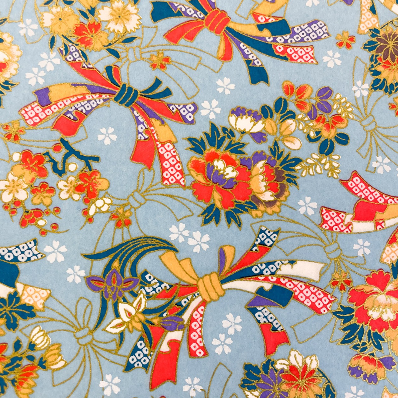 友禅和紙 華やか束ね熨斗 牡丹 梅 小花 水色地 大判 約63x93cm 千代紙 YUZEN dyeing 124722122