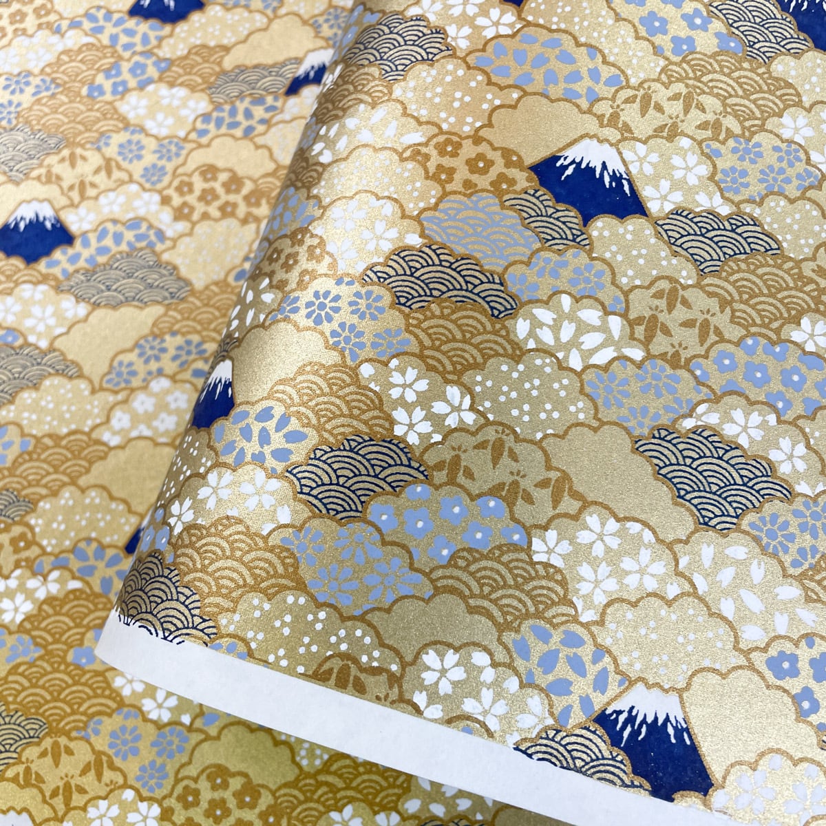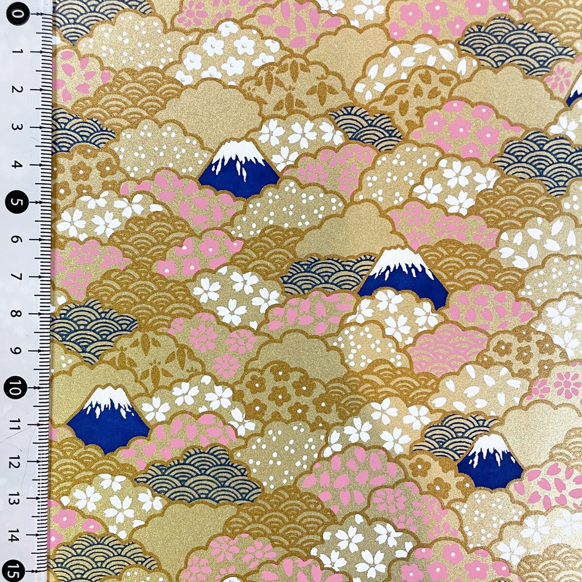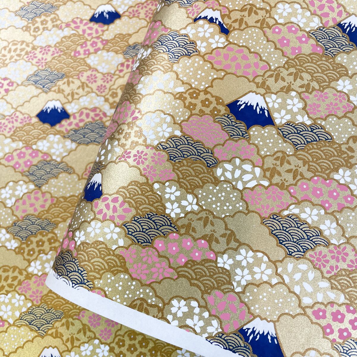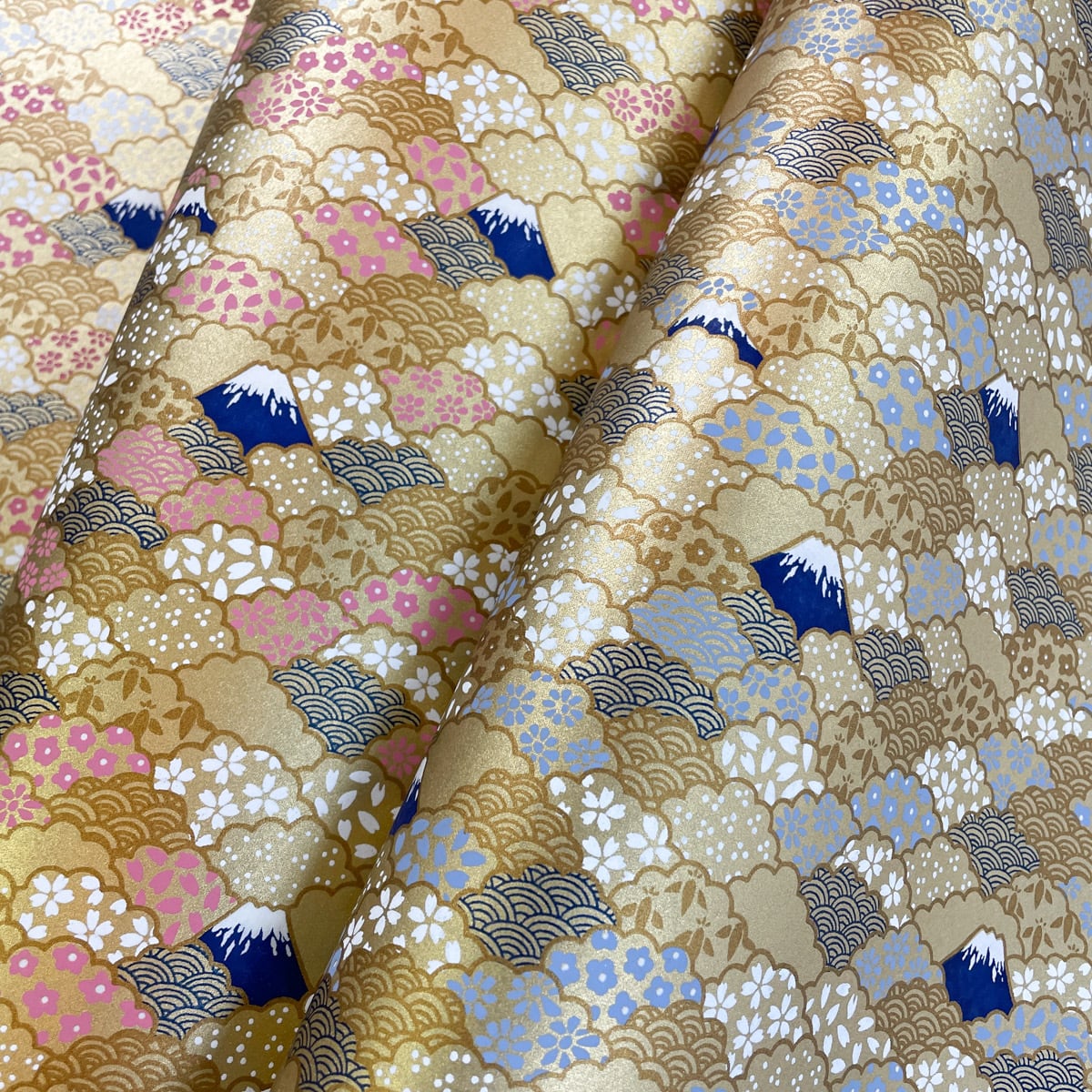 華やかな友禅和紙 富士山と雲 かわいい桜 金地 ピンク ブルー 桃色 水色 大判 約63x93cm 千代紙 Yuzen dyeing 120999036