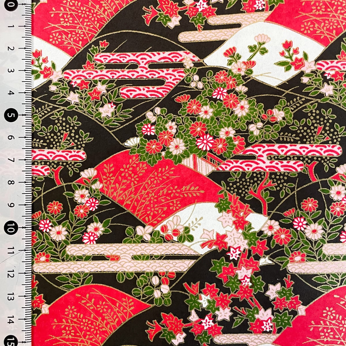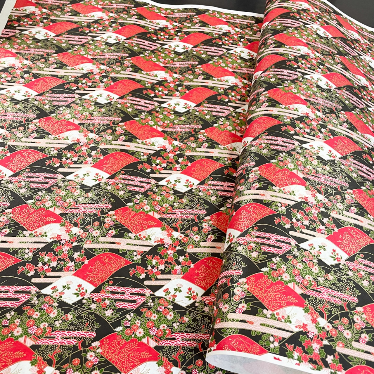 友禅和紙 秋の山々 紅葉 菊 萩 小花 黒 赤 大判 約63x93cm 千代紙 Yuzen dyeing