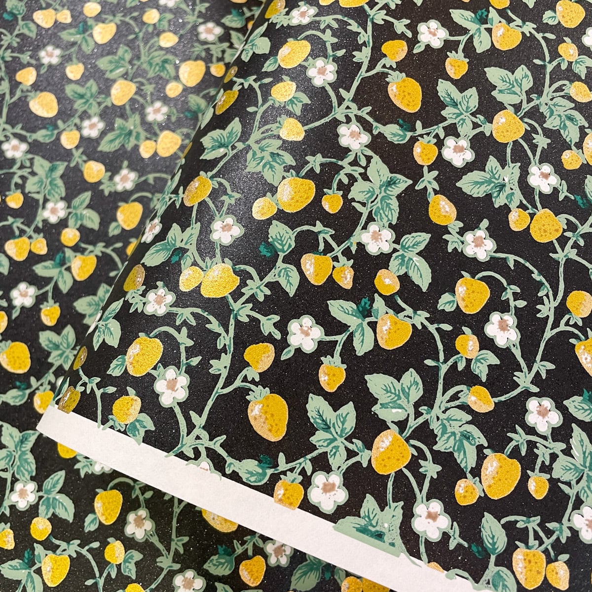 洋風柄 華やかな友禅和紙 黄色のいちご柄 黒地 ワイルドストロベリー 大判 約63x93cm YUZEN dyeing 126506909