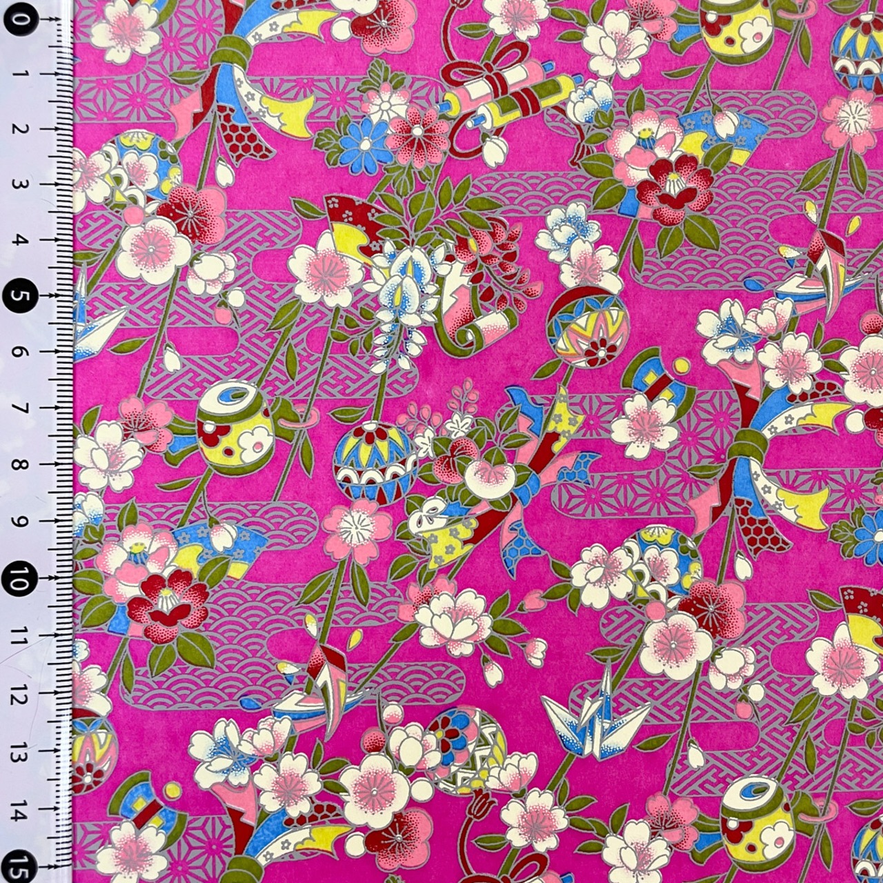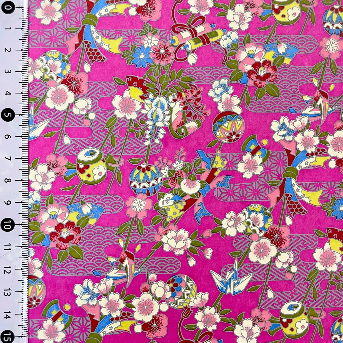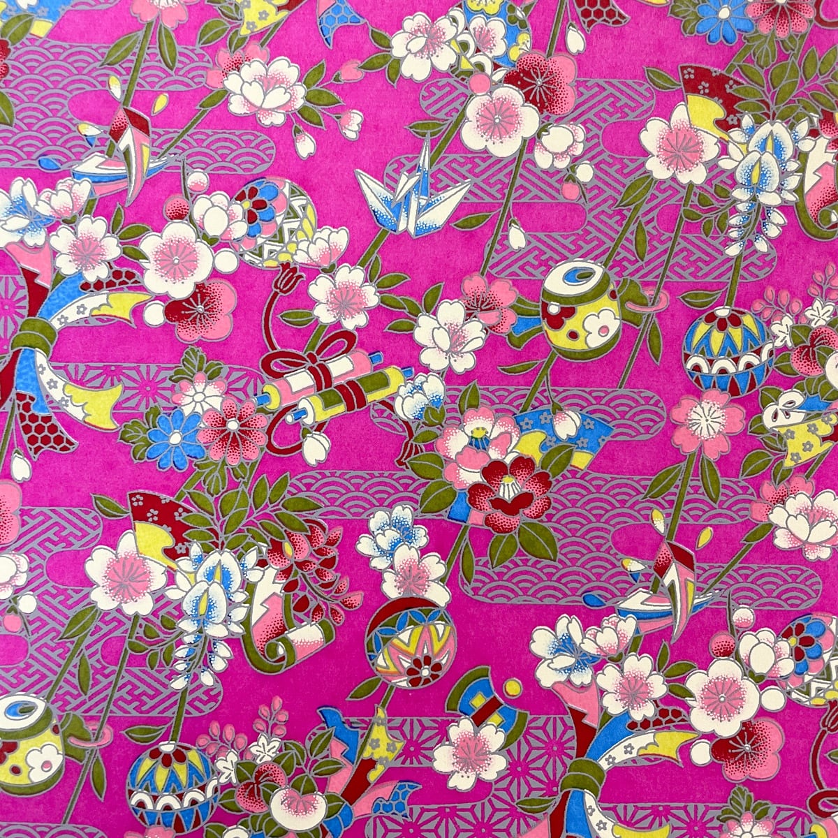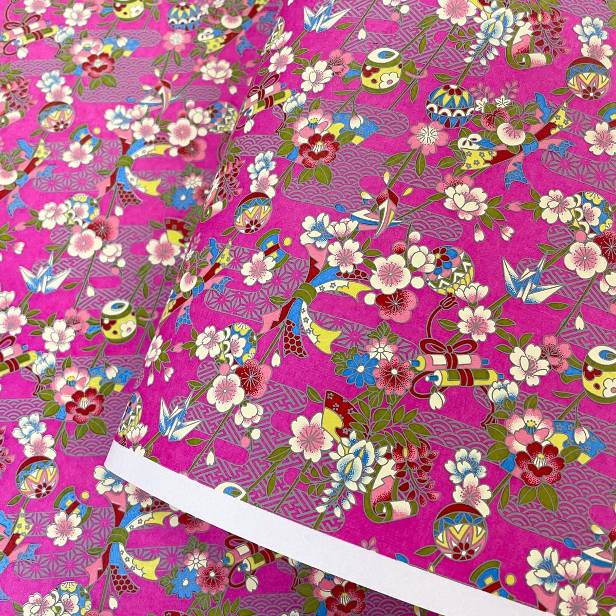 友禅和紙 華やか熨斗と毬 桜と梅 折り鶴 濃いピンク ビビッドピンク 大判 約63x95cm 千代紙 YUZEN dyeing