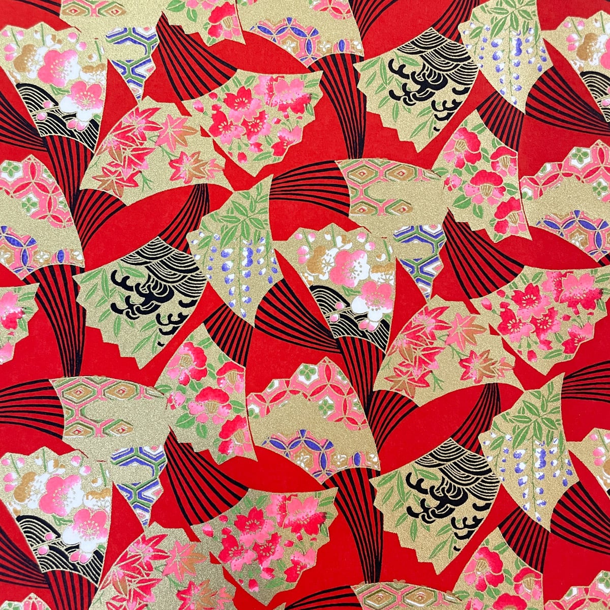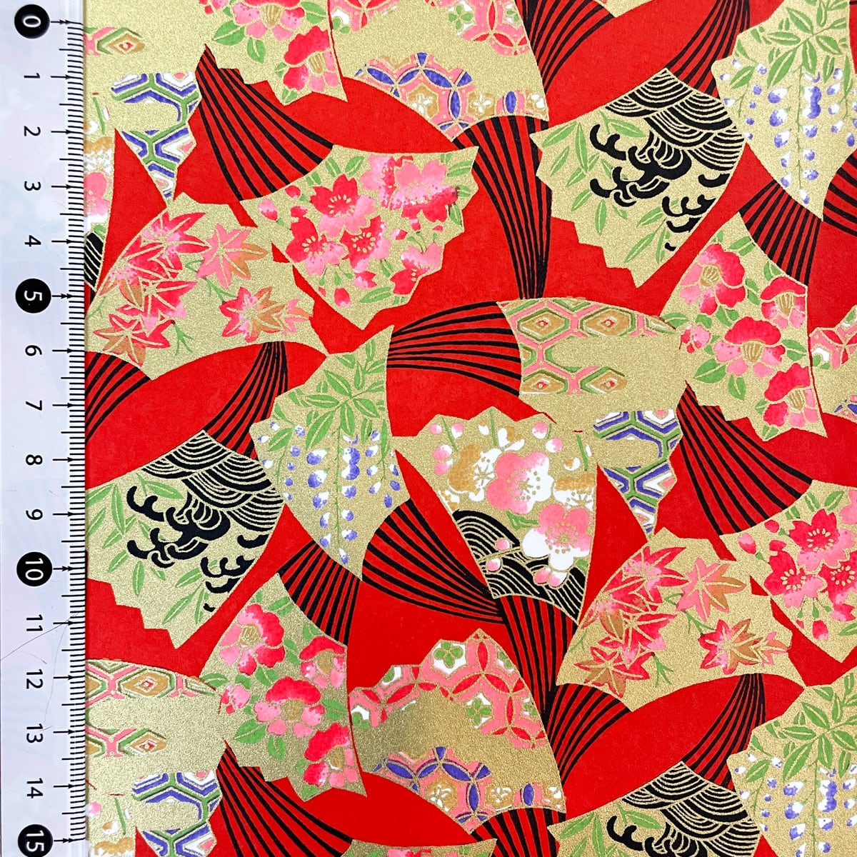 華やかな友禅和紙 季節の花が美しい金扇 赤地 大判 約63x93 cm 千代紙 YUZEN dyeing