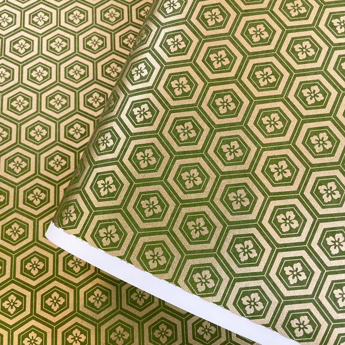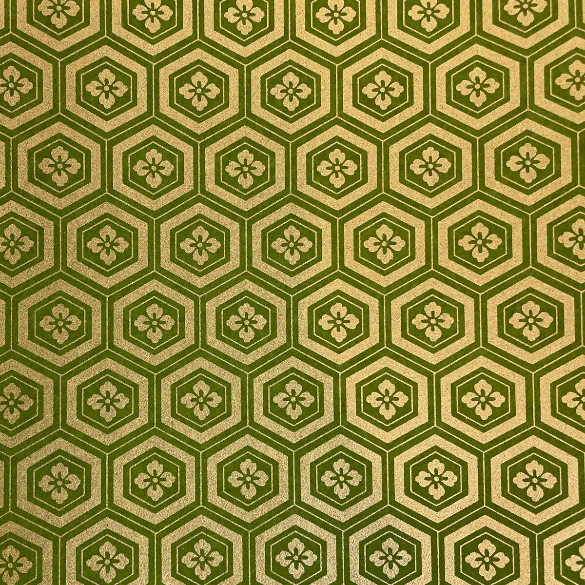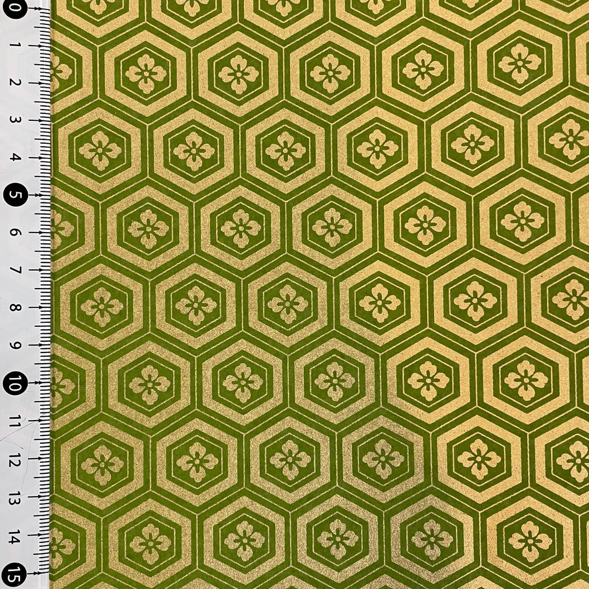 金色が華やかな加賀友禅 和紙 亀甲花菱 緑 抹茶色 大判 約63x93cm 千代紙 KAGA YUZEN Dyeing