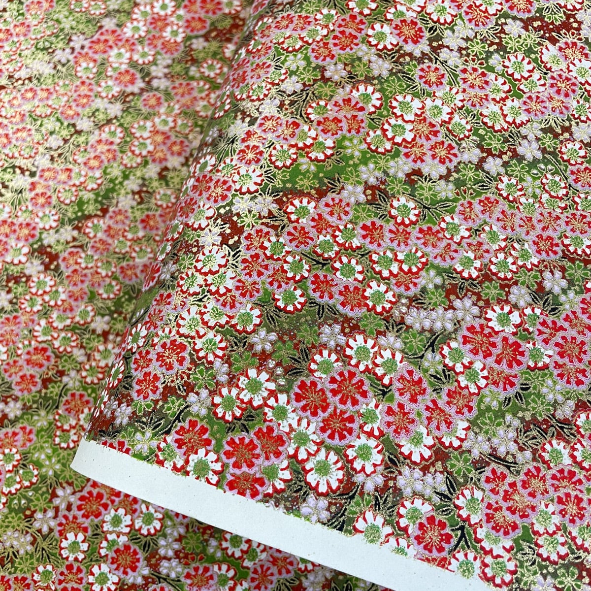 友禅和紙 斜めに並べた咲きこぼれる小花 赤 緑 大判 約63x93cm 千代紙 Yuzen dyeing