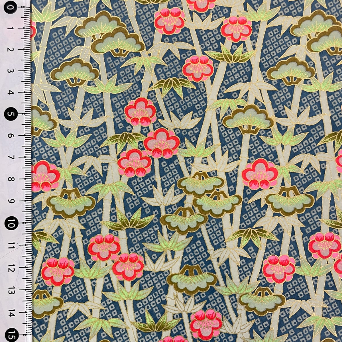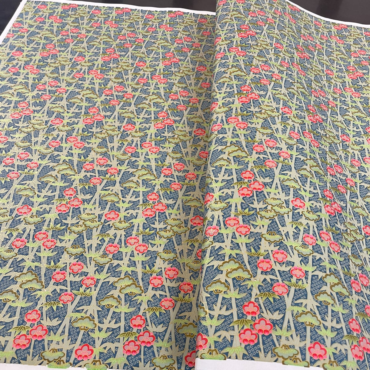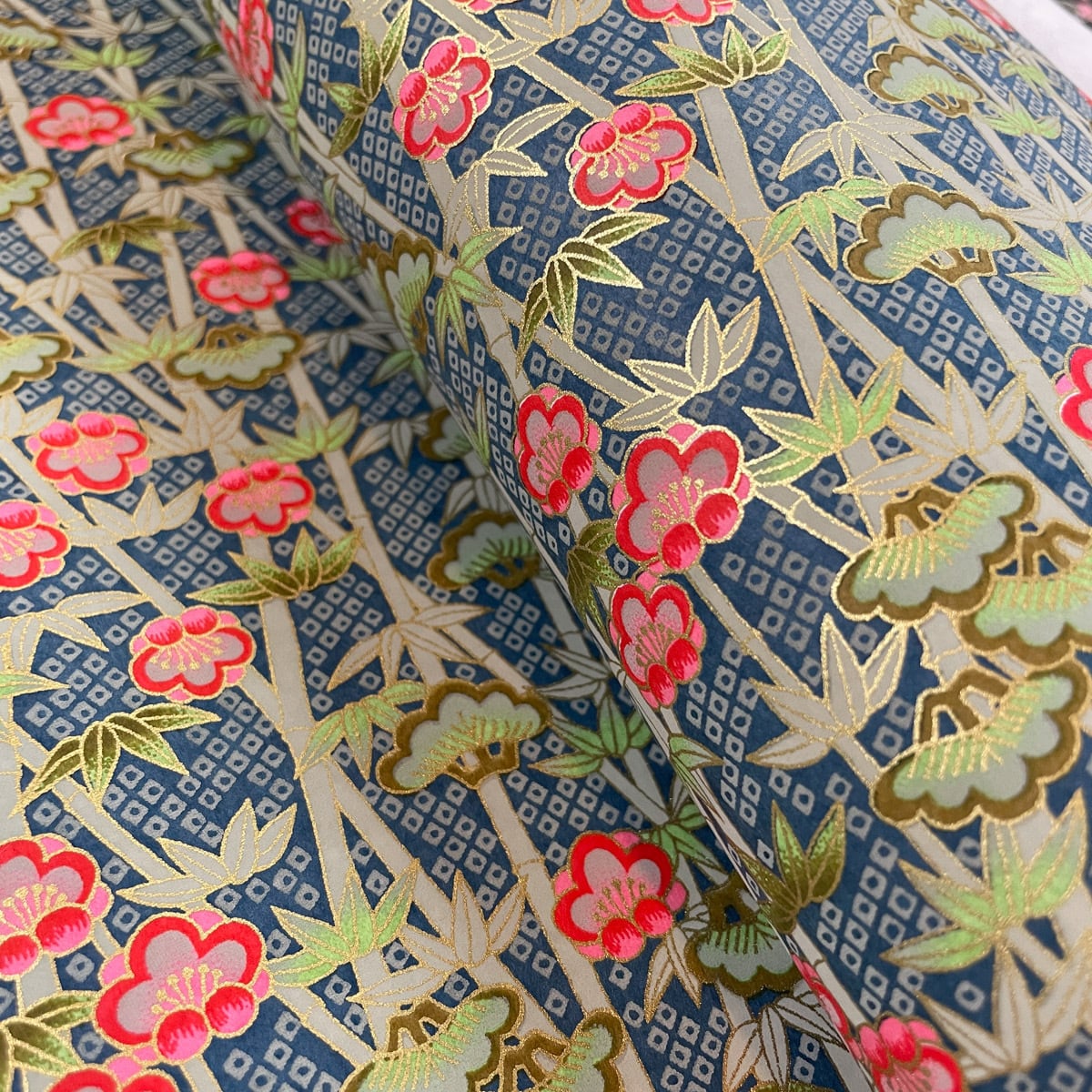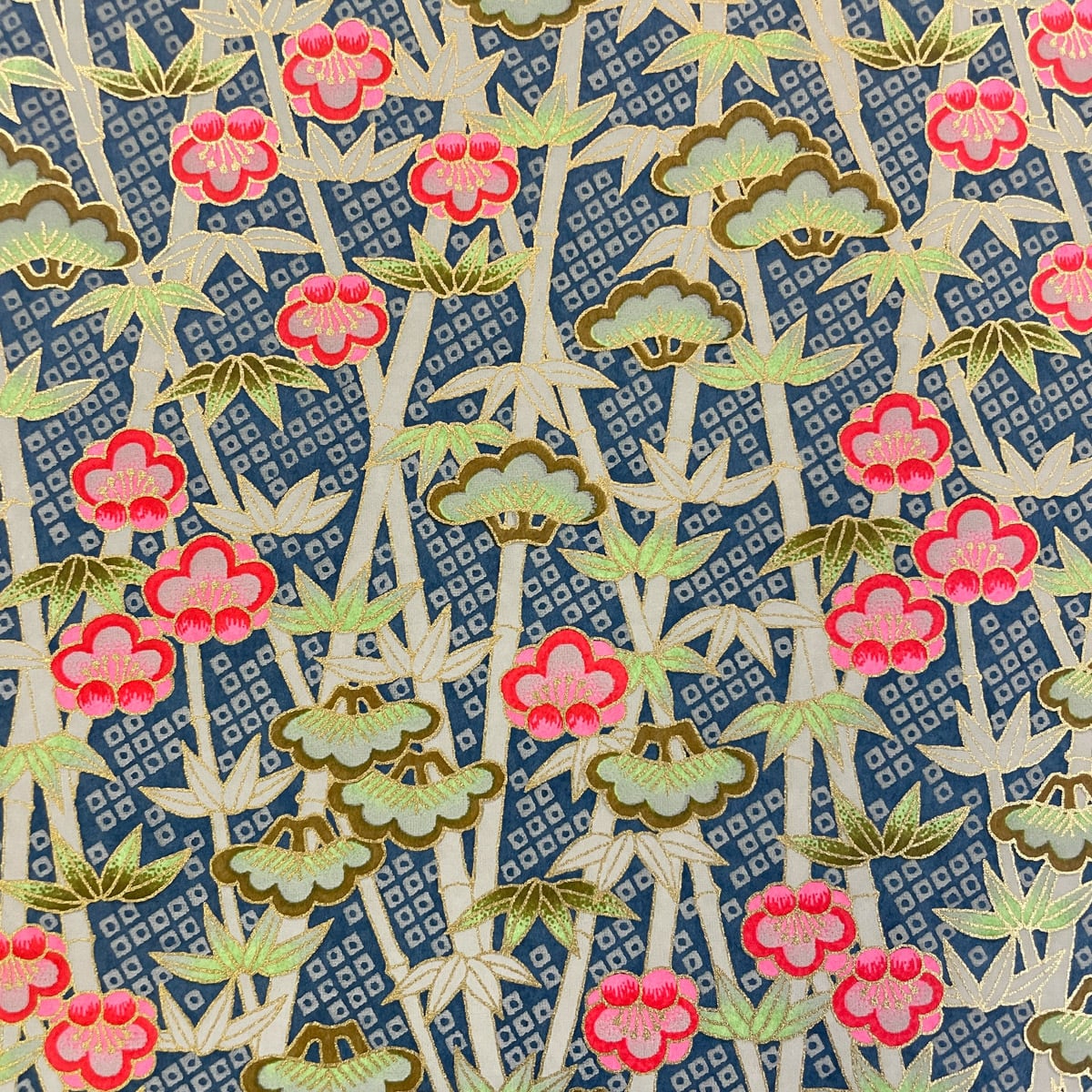 華やかな友禅紙 松竹梅 鹿の子紋様 深緑色地 大判 約63x95cm 千代紙 YUZEN dyeing