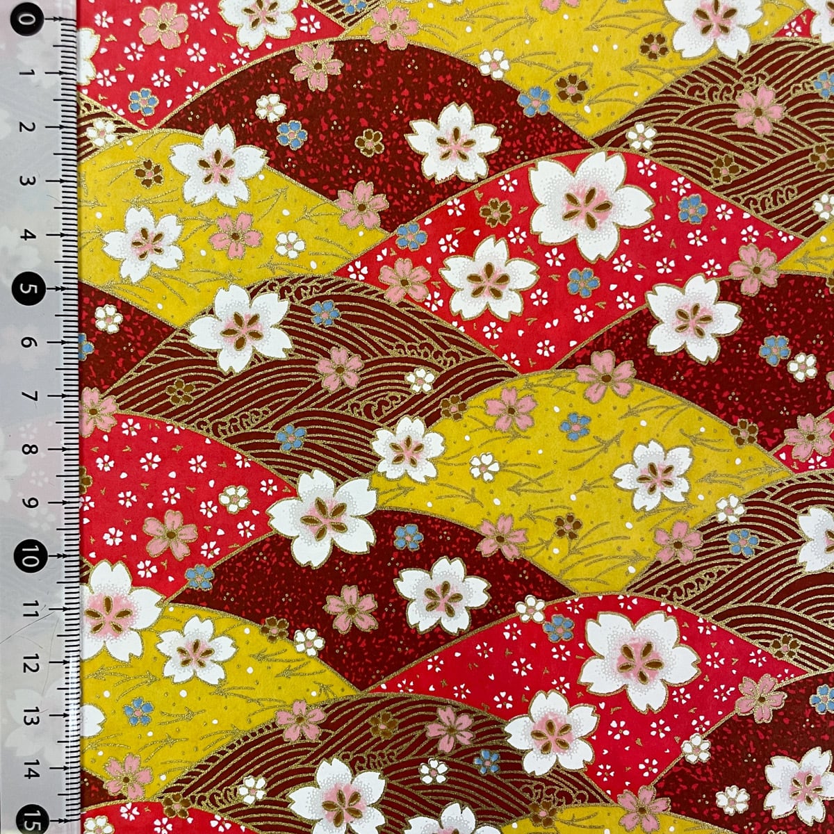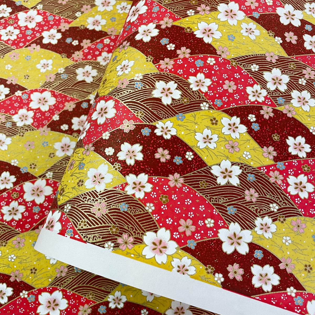 友禅和紙 華やかな波と桜 赤 黄 茶色系 大判 約63x93cm 千代紙 YUZEN dyeing