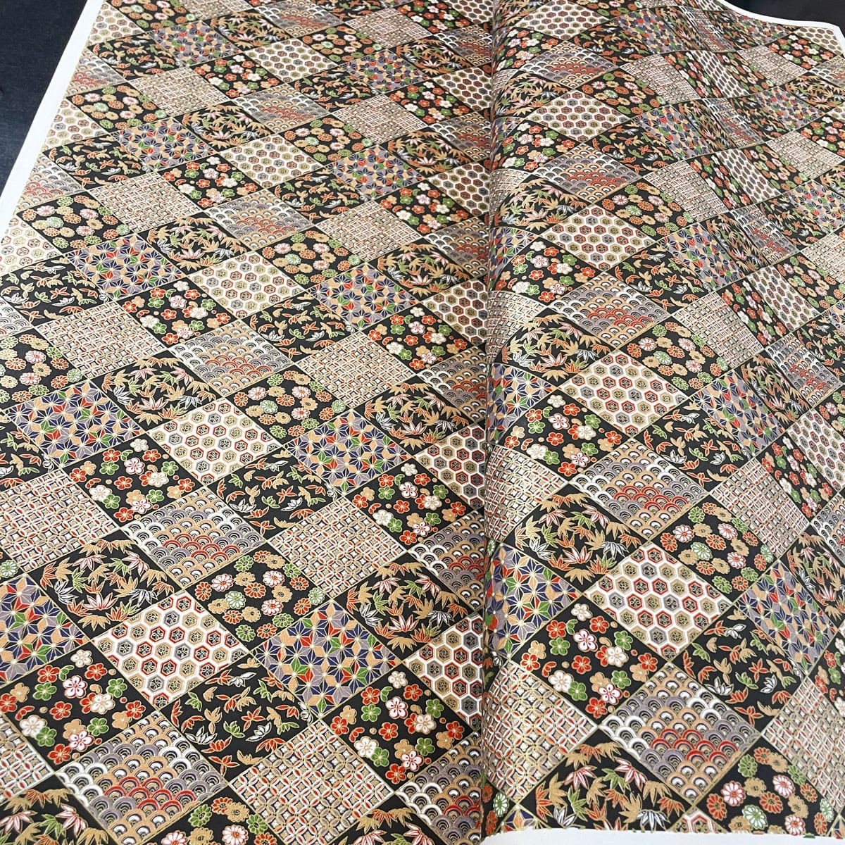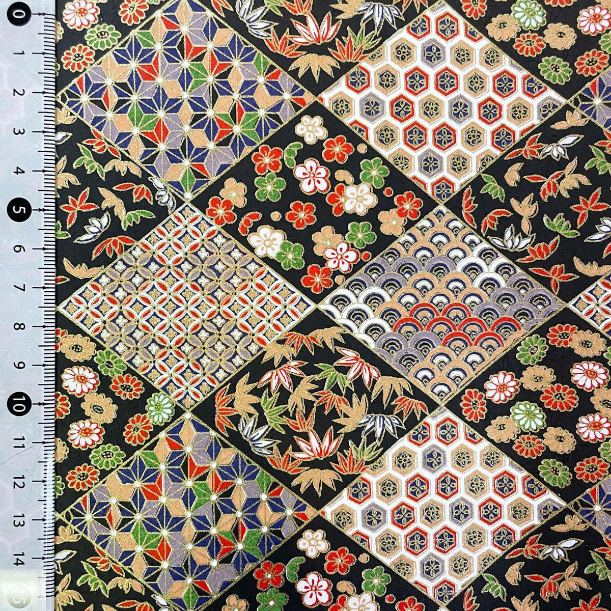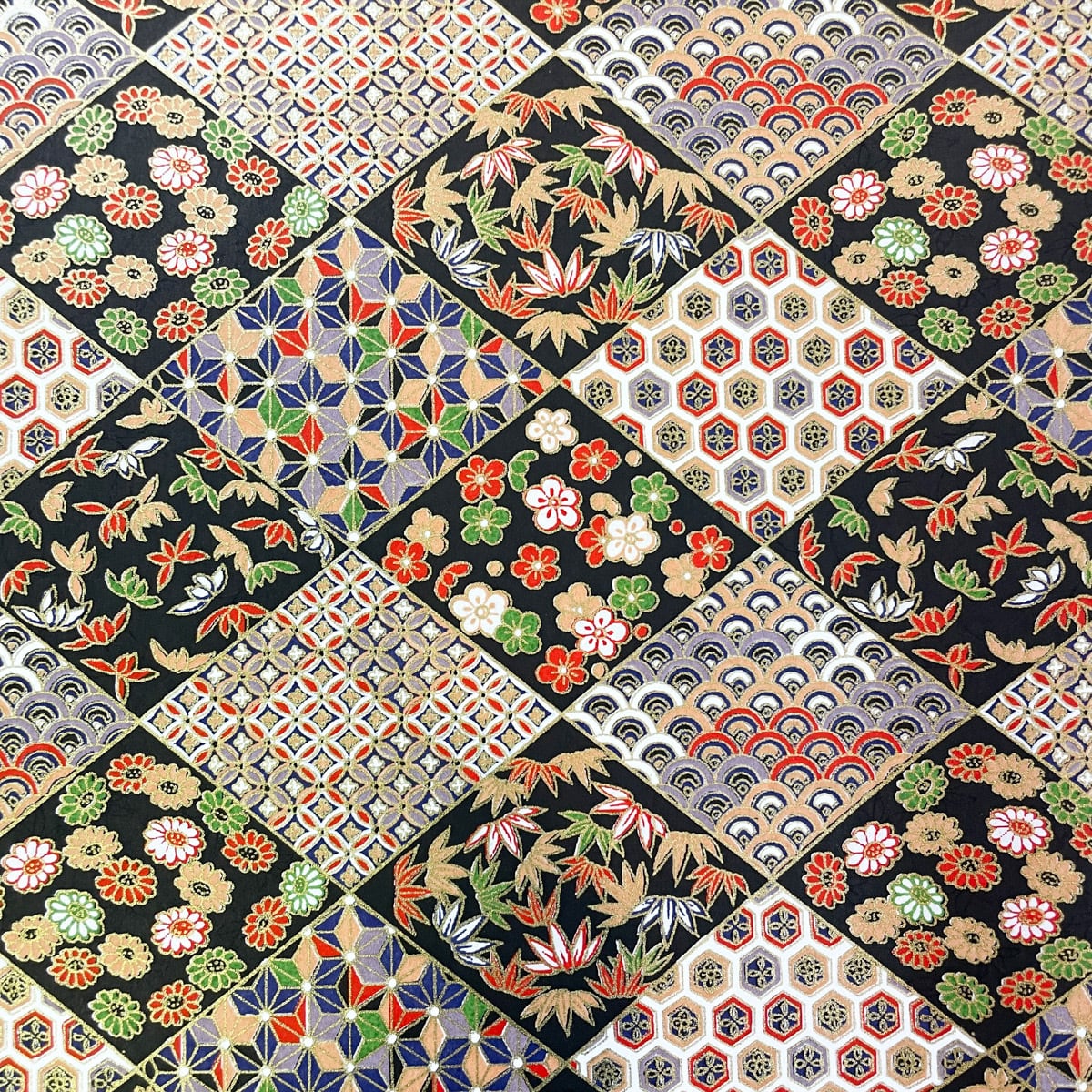 友禅和紙 古典紋様と季節の花々を菱形に収めて 黒 大判 約63x93cm 千代紙 YUZEN dyeing