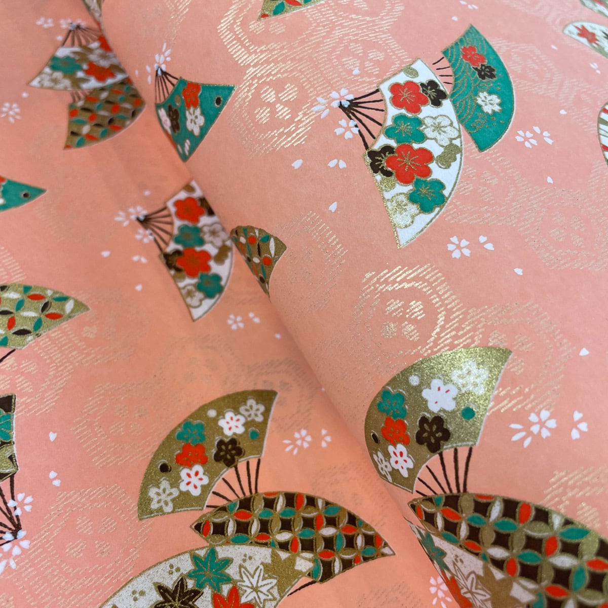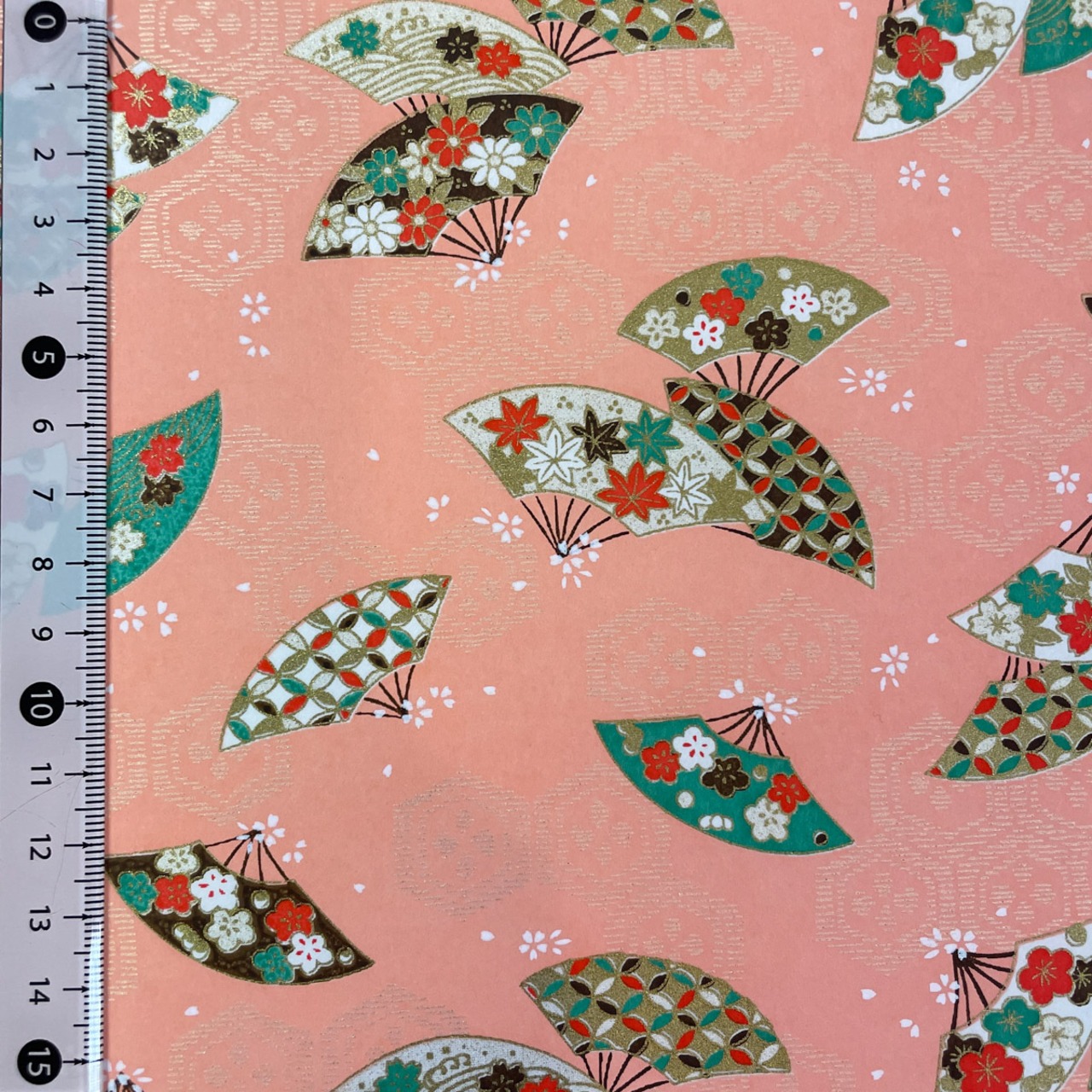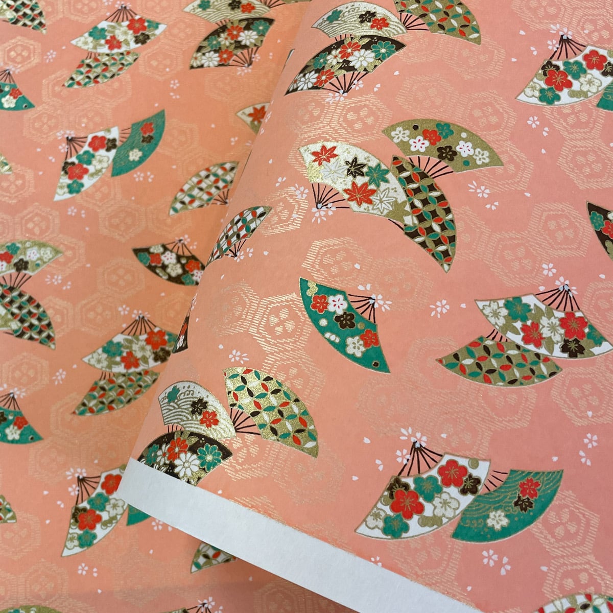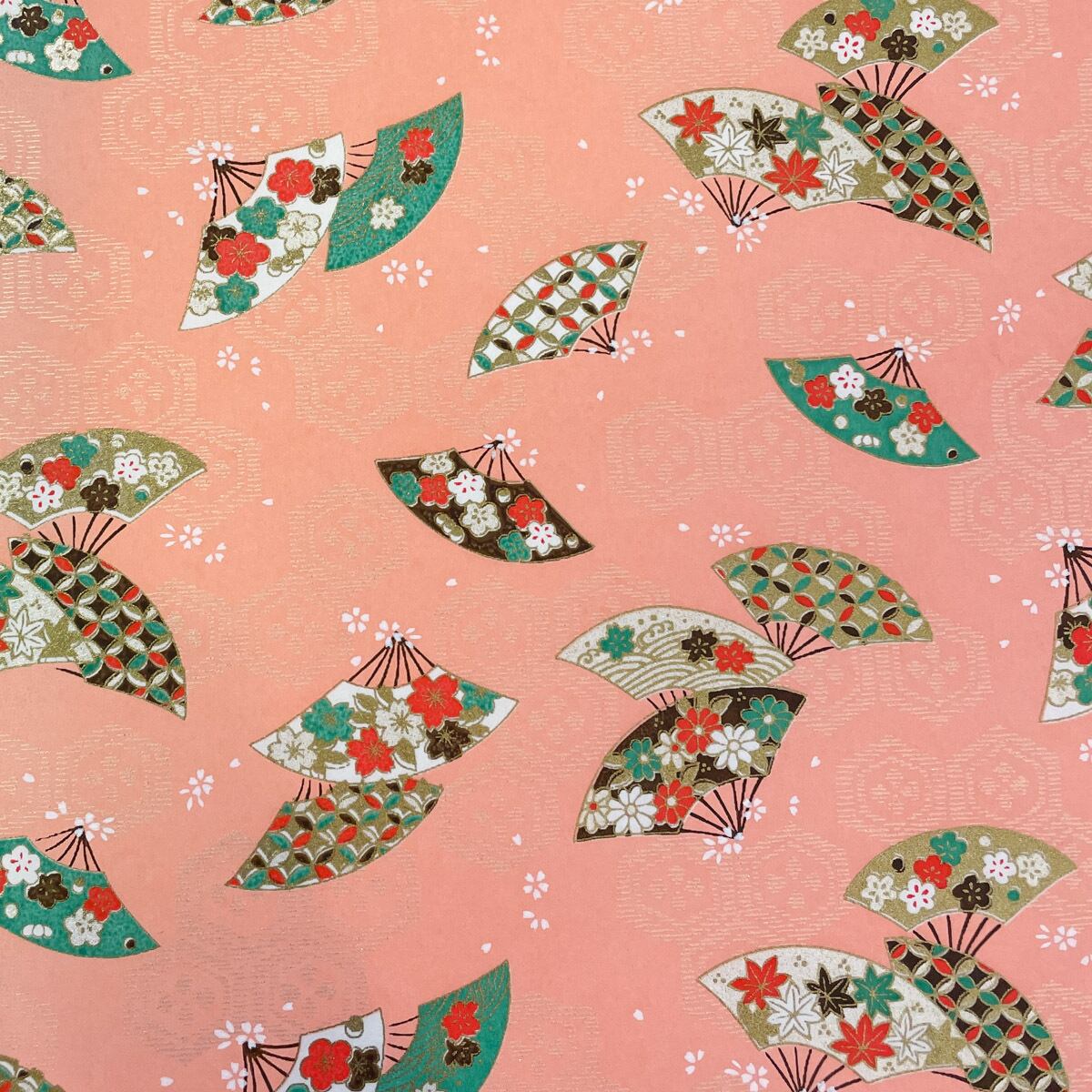 友禅和紙 亀甲花菱の背景に小花と古典柄の扇 サーモンピンク 大判 約63x93cm 千代紙 YUZEN dyeing