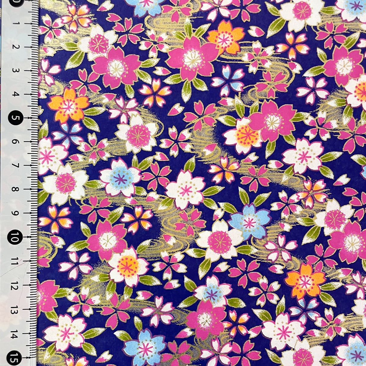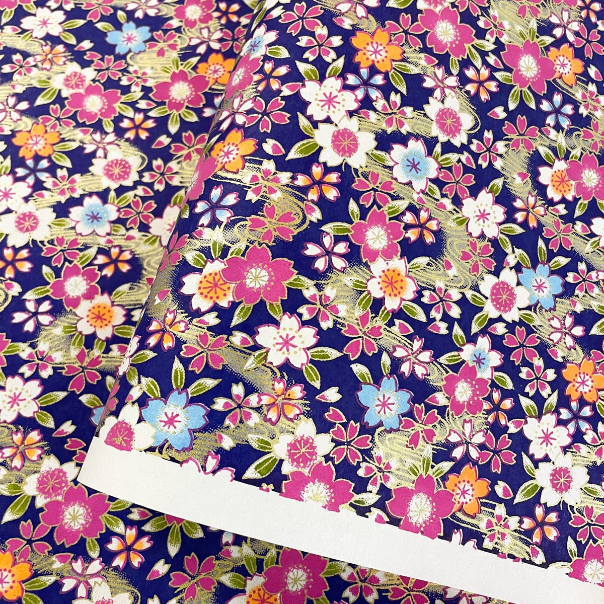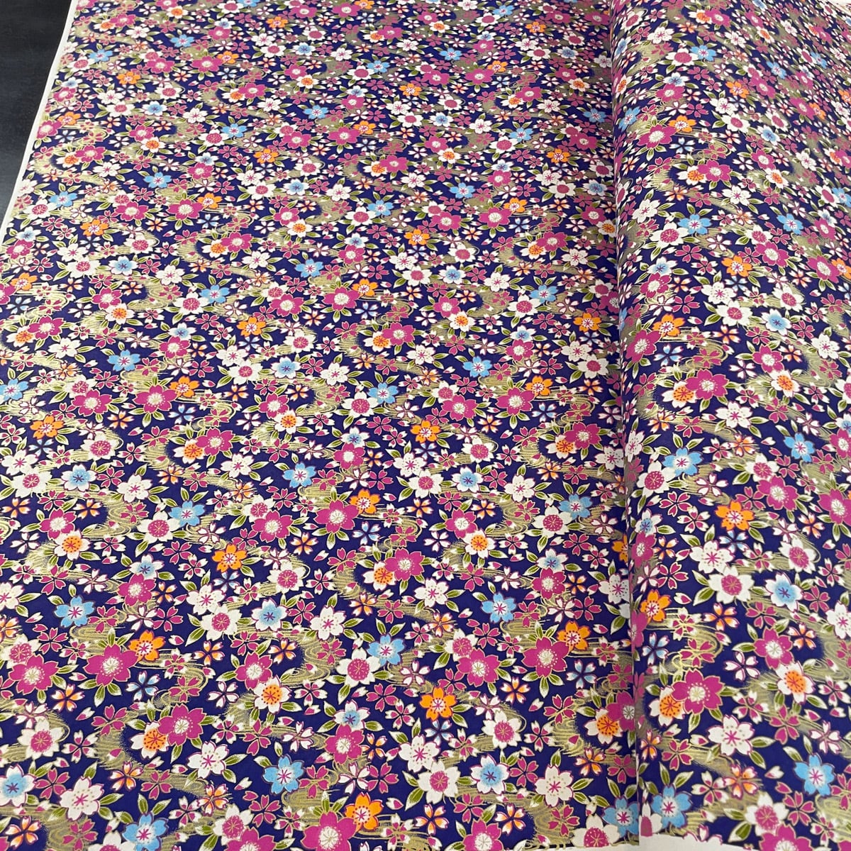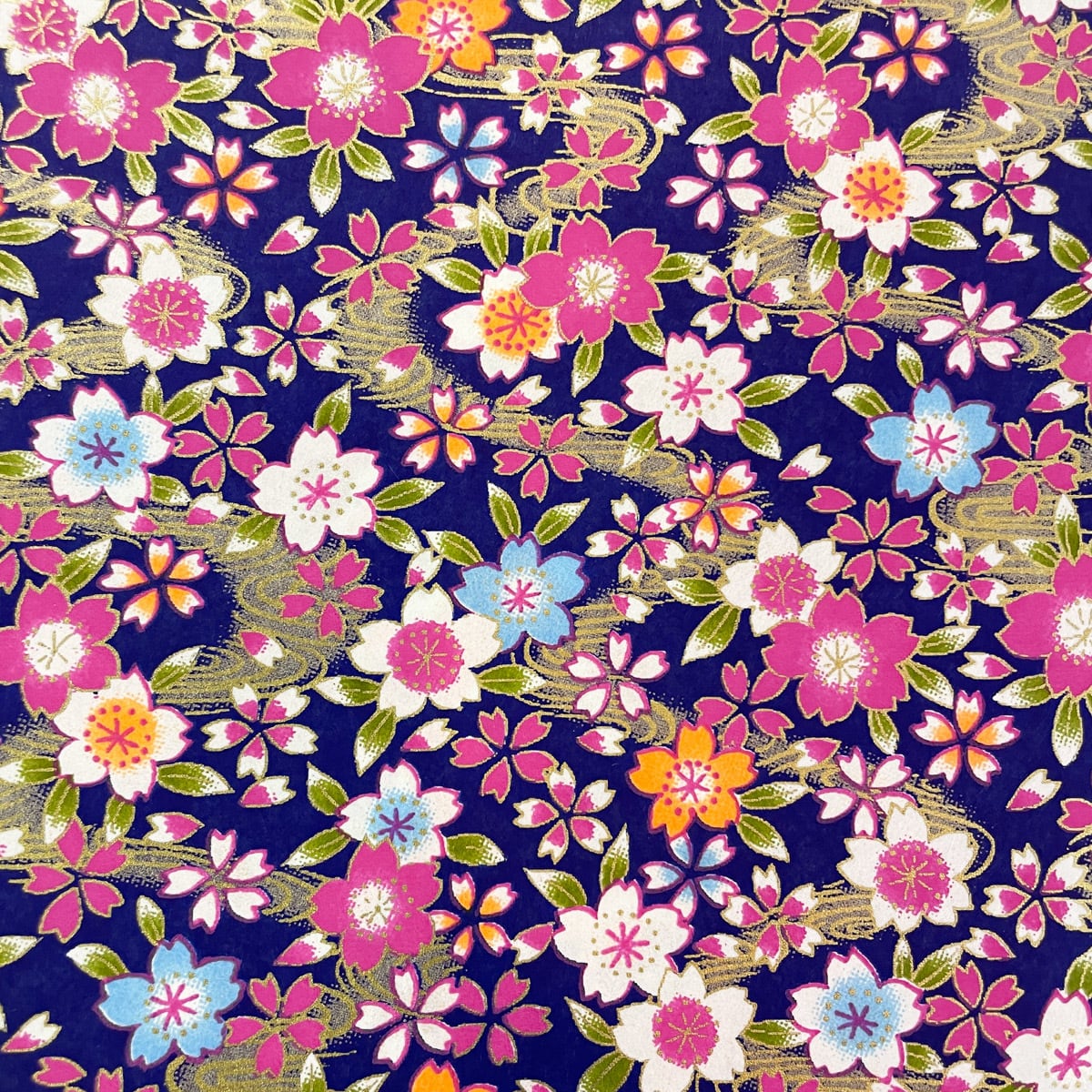 友禅和紙 華やか 水面にカラフルな桜 金の波 紫地 青 紺 大判 約63x93cm 千代紙 YUZEN dyeing