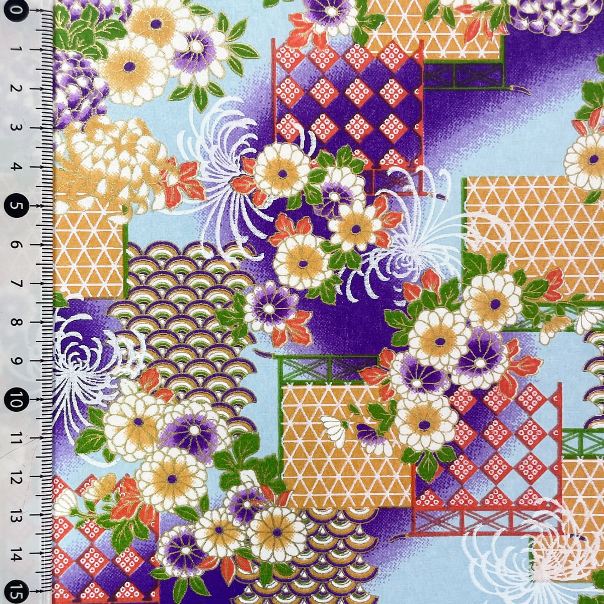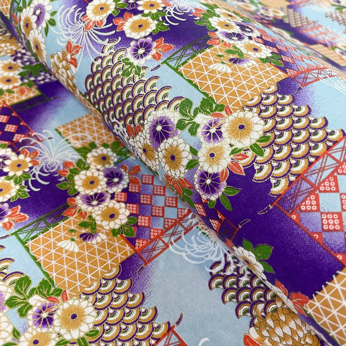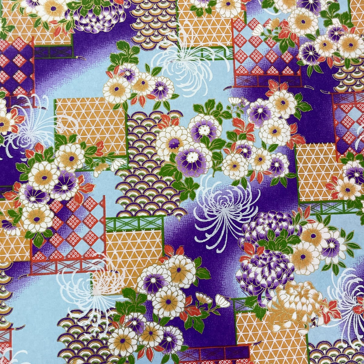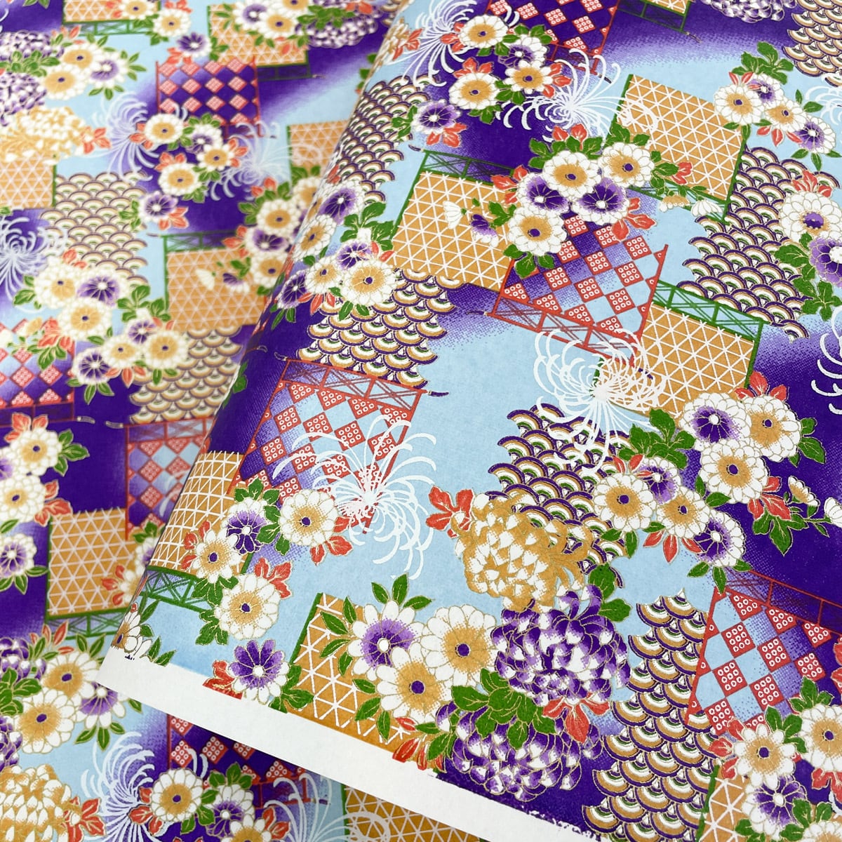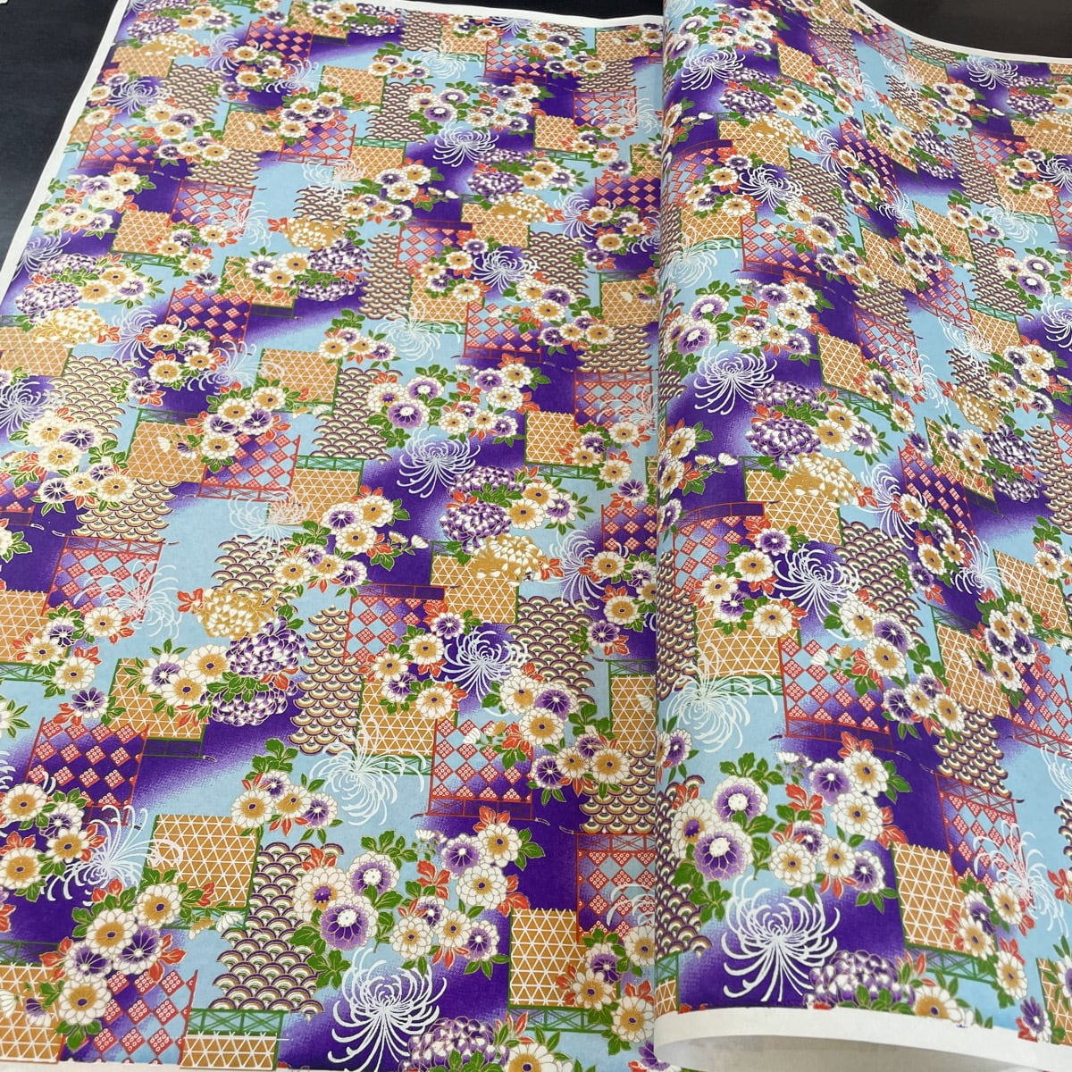友禅和紙 豪華 菊の花と青海波 紫と水色のぼかし 大判 約63x93cm 千代紙 YUZEN dyeing