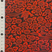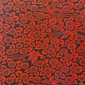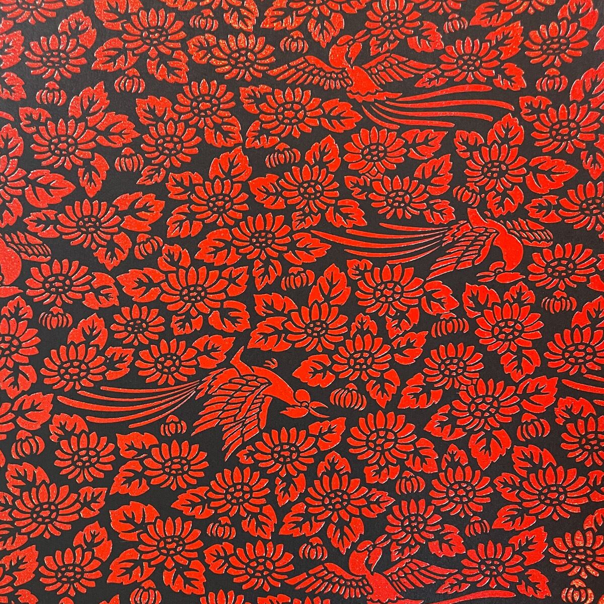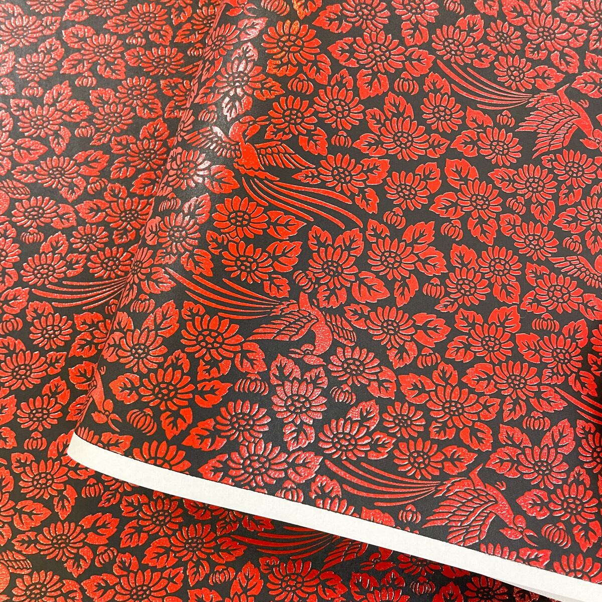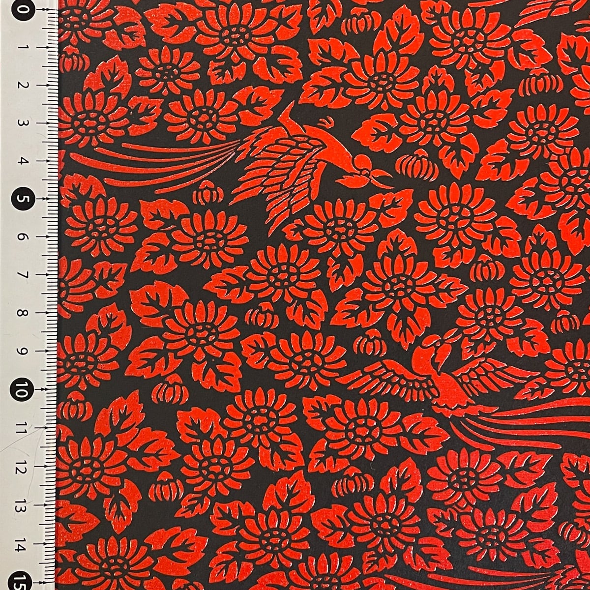 光沢のある黒地に、発泡加工された赤い柄が少しぷっくりした立体感のある豪華な和紙です。
