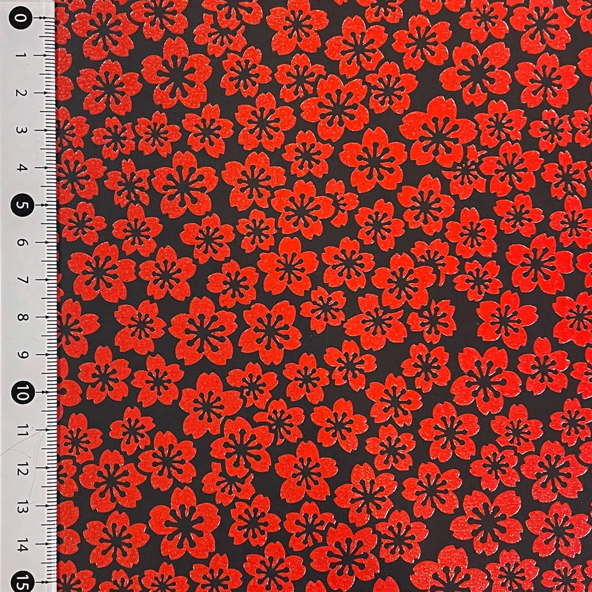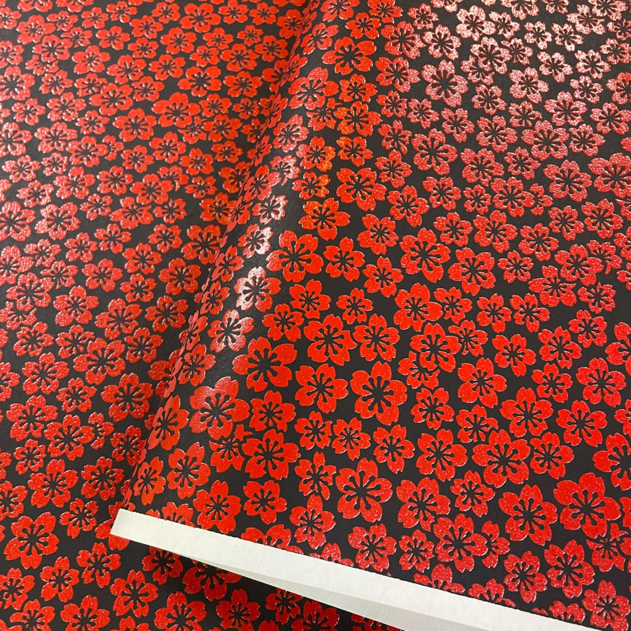光沢のある黒地に、発泡加工された赤い柄が少しぷっくりした立体感のある豪華な和紙です。
