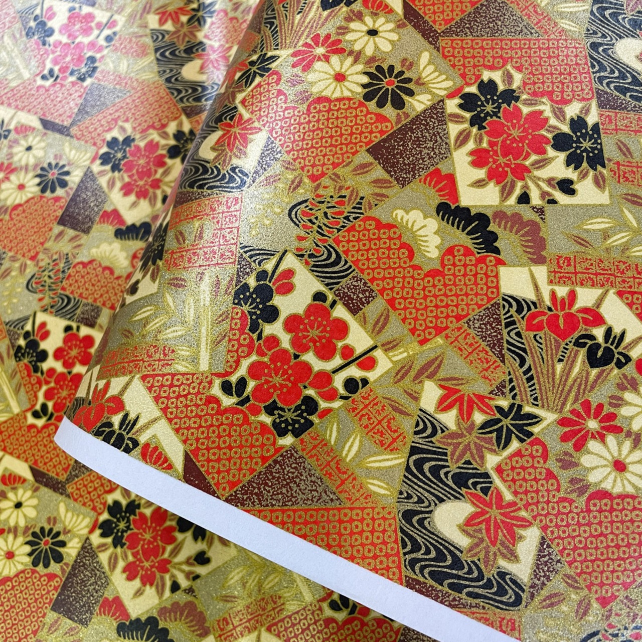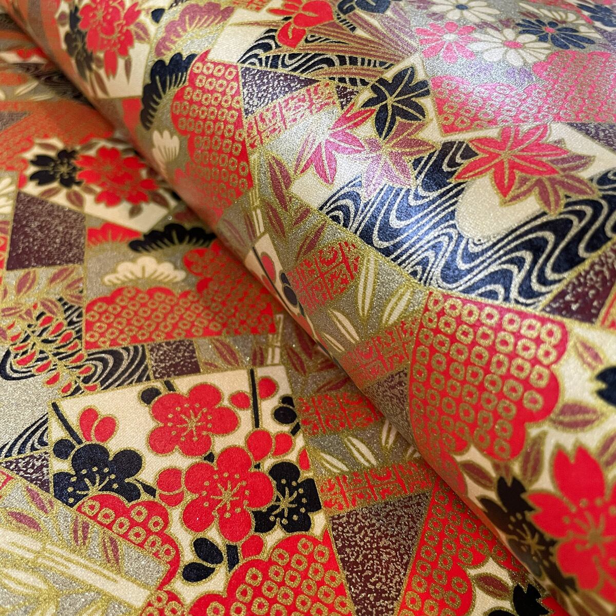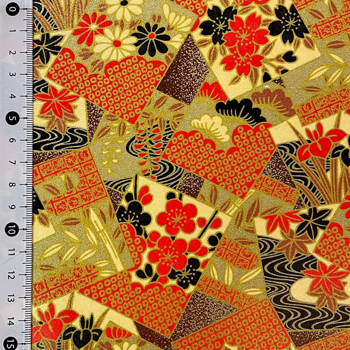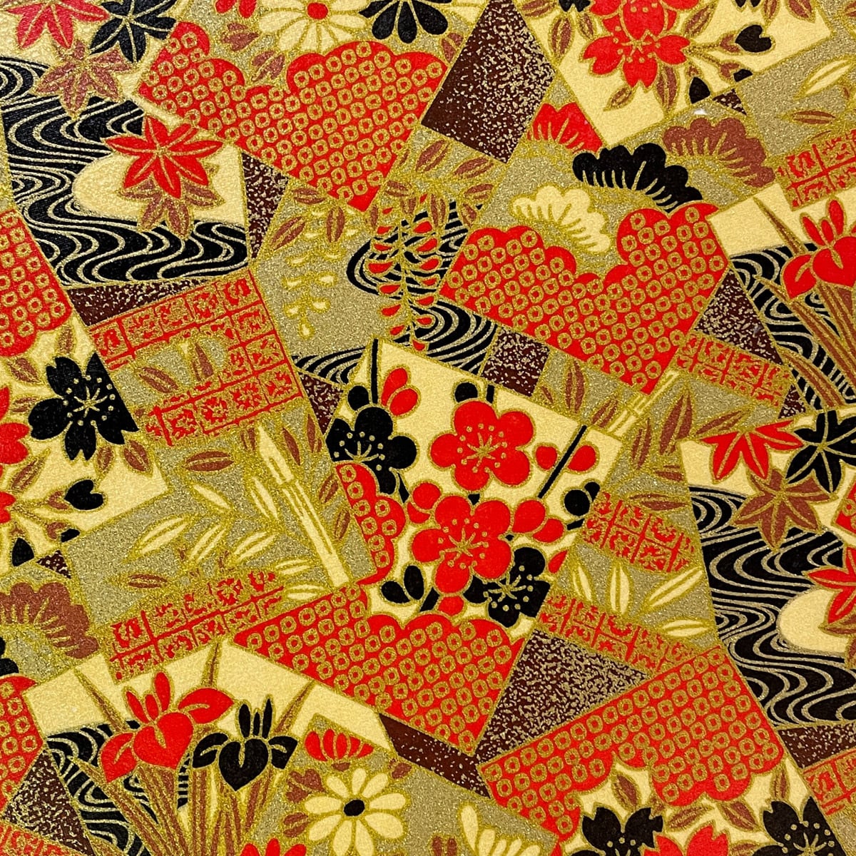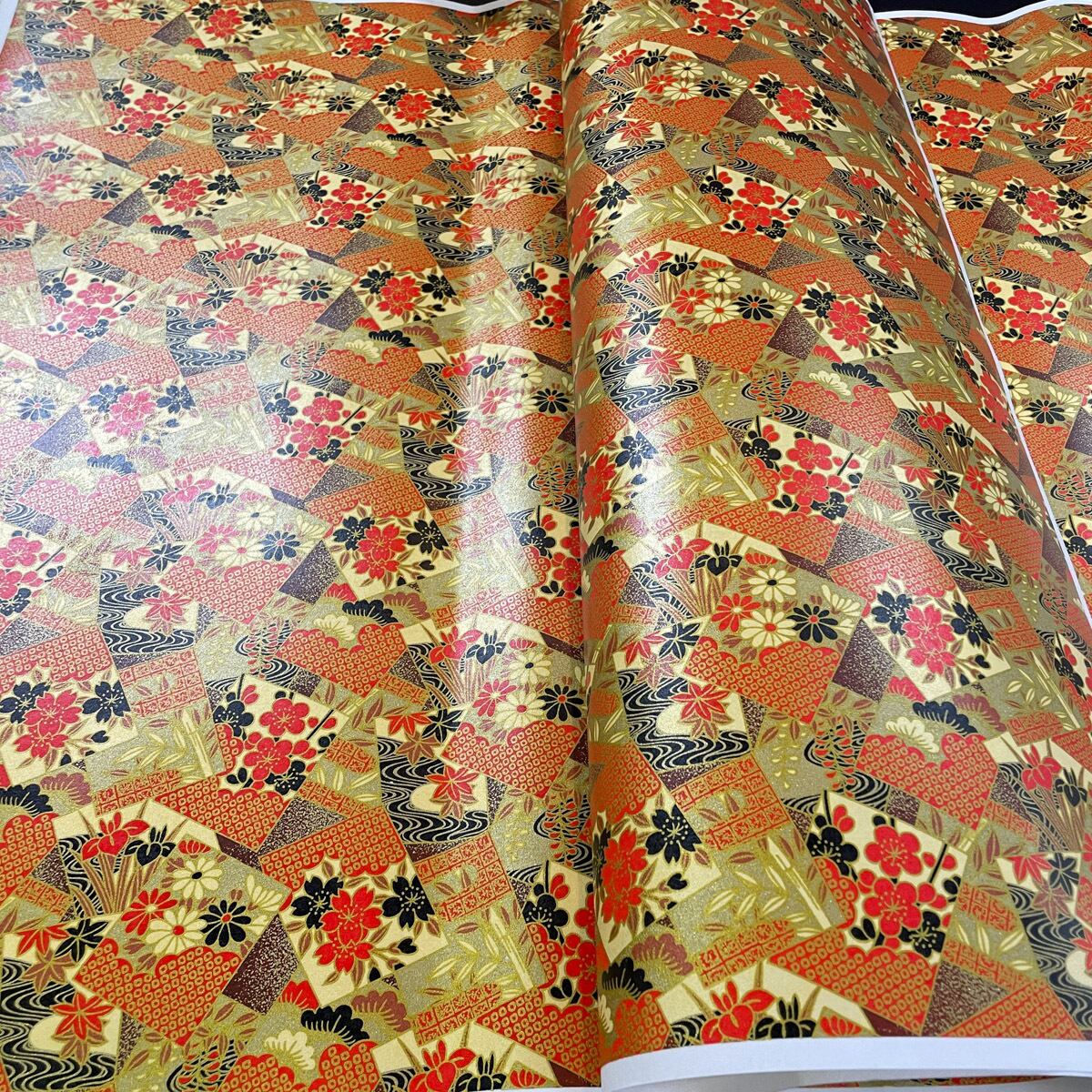 華やかな友禅和紙 豪華金とクリーム色 蒔絵風 松竹梅 季節の花のカルタ 大判 約63x95cm 千代紙 YUZEN dyeing