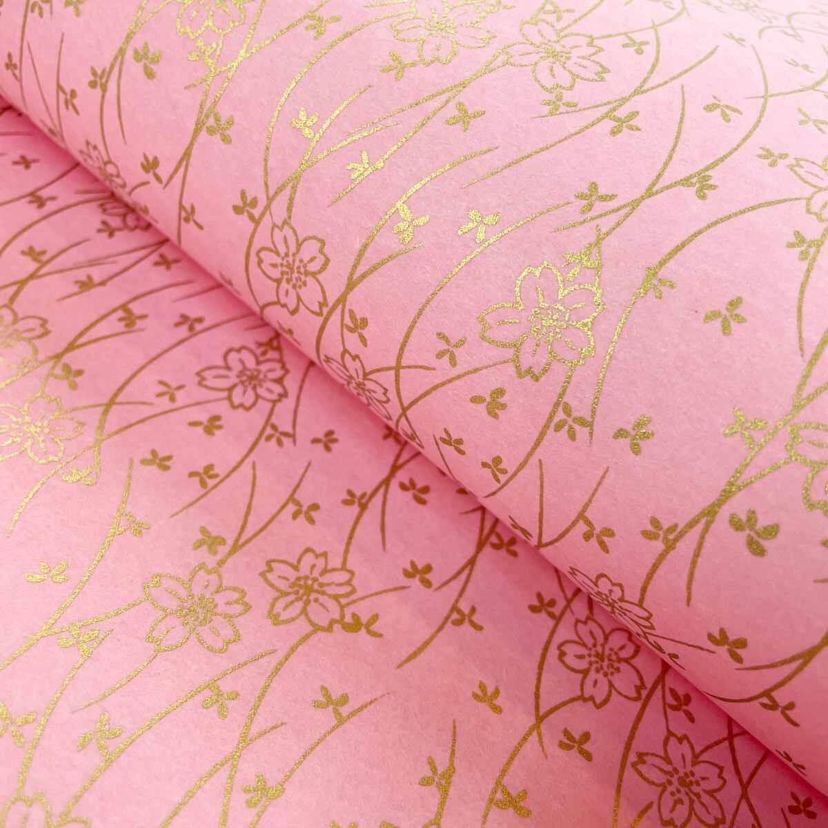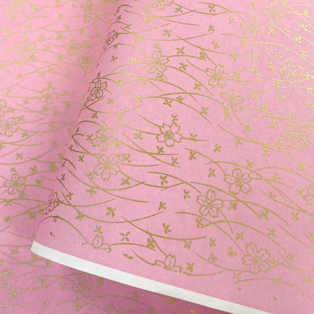 金色が華やかな加賀友禅 和紙 桜と露芝 桃色 ピンク 菊判 大判 約63x93cm KAGA YUZEN Dyeing