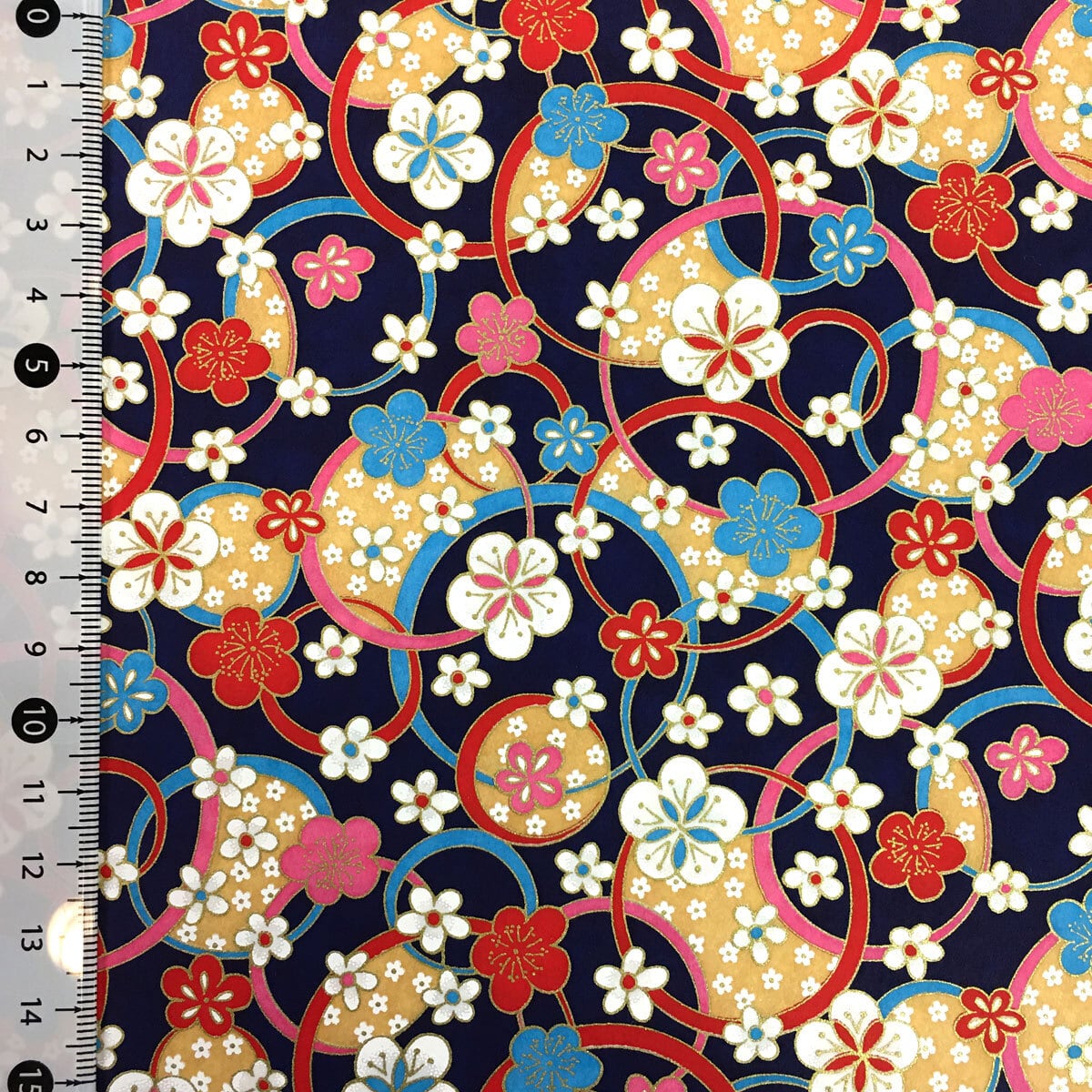 華やかな友禅紙 YUZEN dyeing 華やか梅と輪模様 紺地 約63x95㎝ 千代紙