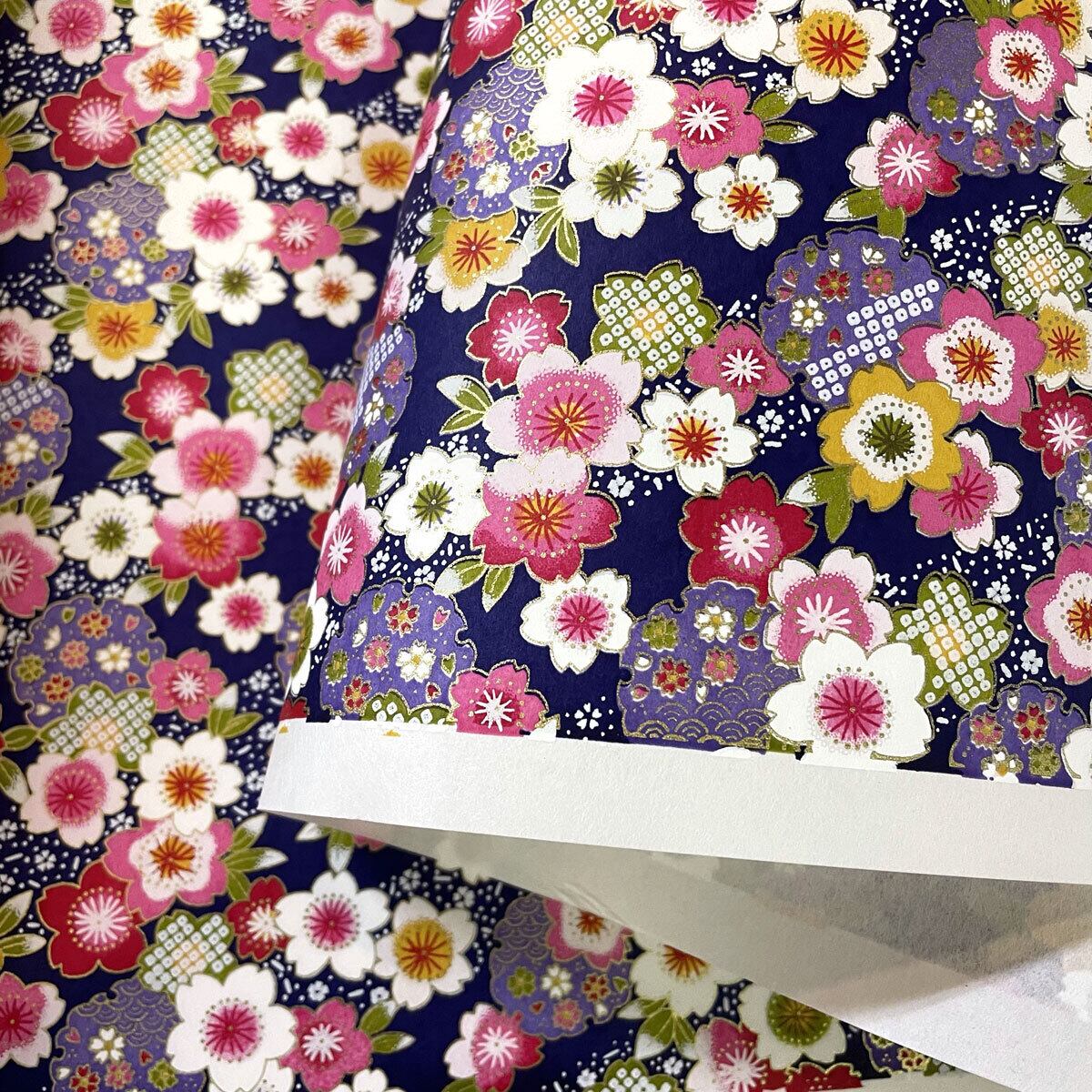 華やかな友禅紙 YUZEN dyeing 華やかな桜と雪輪紋 紺 紫 約63x95㎝