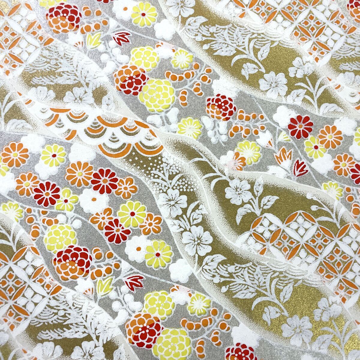 華やかな友禅紙 YUZEN dyeing 切り継ぎ模様に秋の草花 菊 小花 赤 紺 桃色 水色 折り紙、連鶴、クラフトに 約63x95㎝