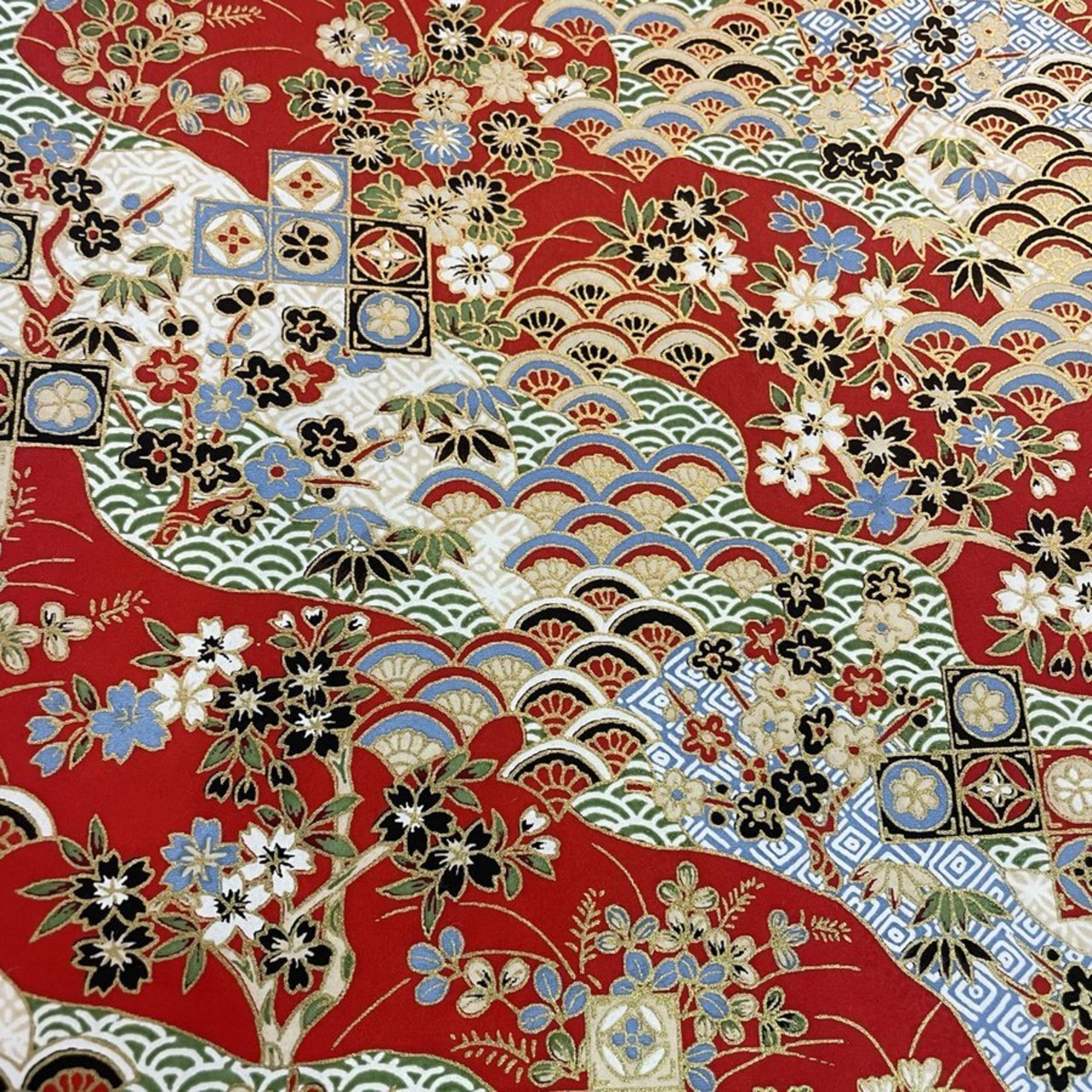 華やかな友禅紙 YUZEN dyeing 青海波に桜 萩 梅 菊 赤 約63x95㎝