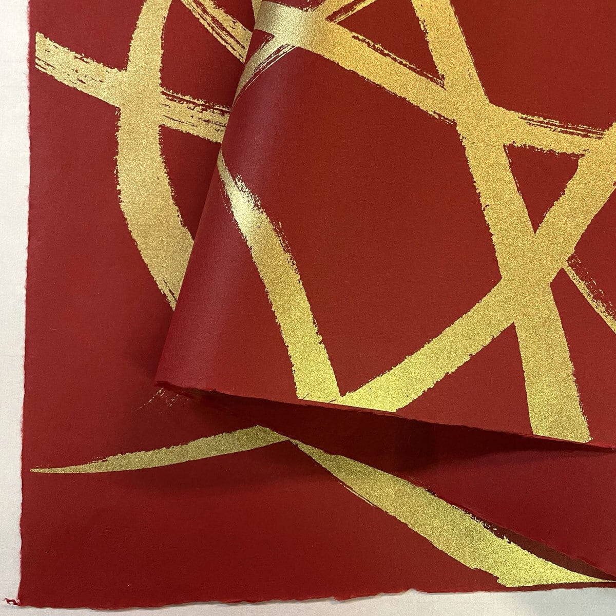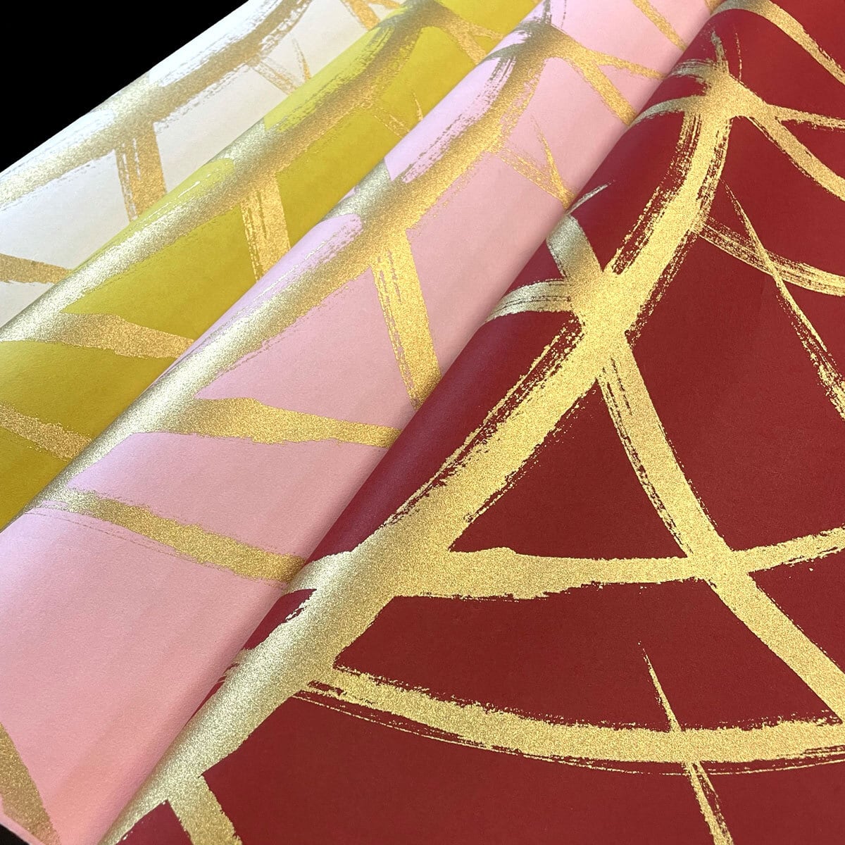 手漉きの染め和紙に金で大胆な手書き風模様を染めた華やかな和紙です。