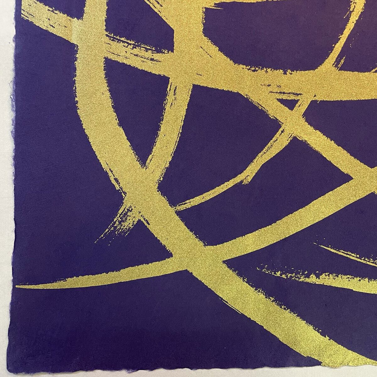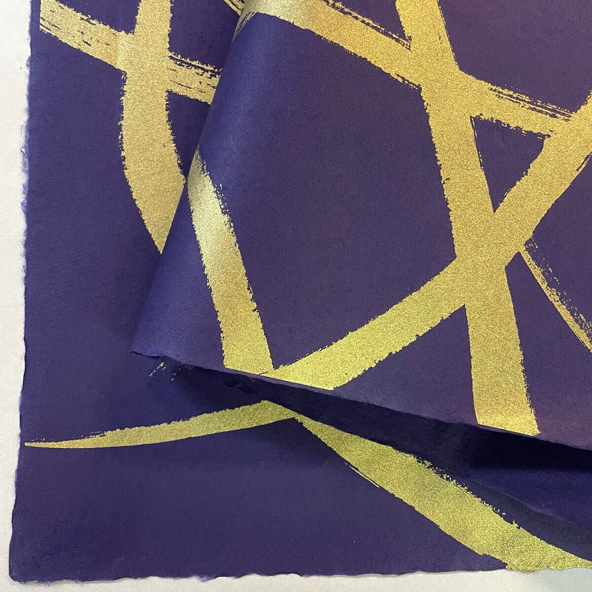 手漉きの染め和紙に金で大胆な手書き風模様を染めた華やかな和紙です。