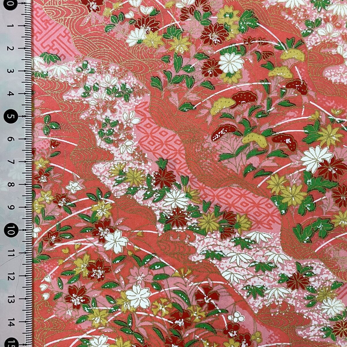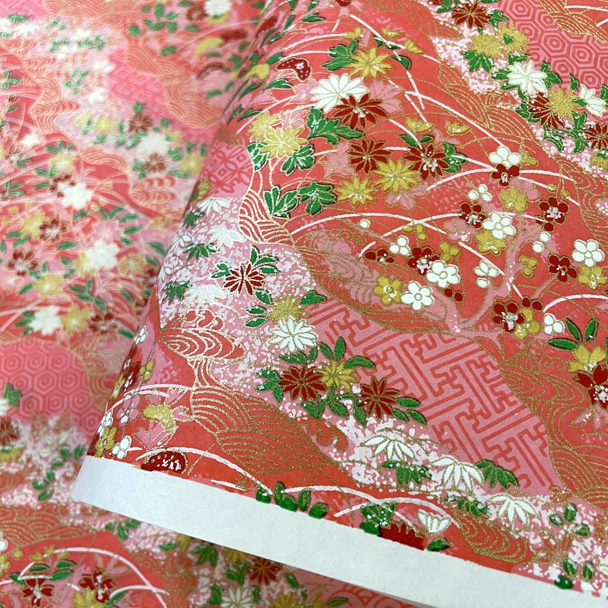 華やかな友禅紙 YUZEN dyeing ピンク地 切り継ぎ模様に波と草花 菊 桔梗 萩 大判 約63x93cm 51377817
