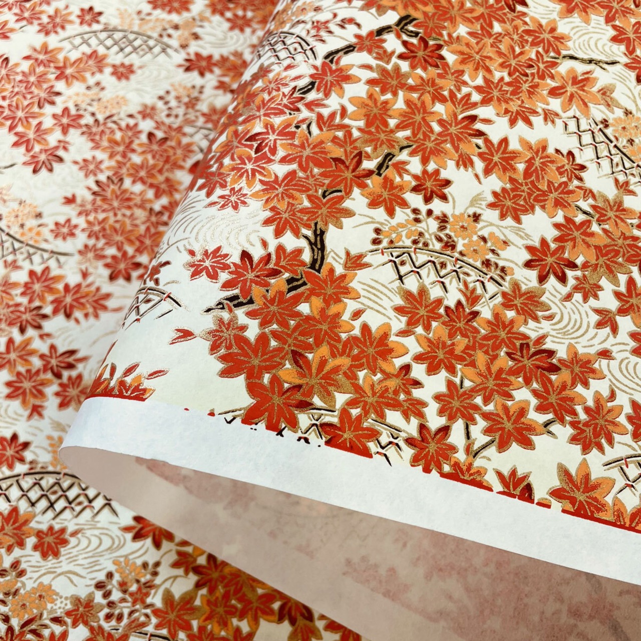 華やかな友禅和紙 紅葉 秋 庭園 のもみじと水の流れ 朱色 赤 大判 約63x93cm YUZEN dyeing 52653089