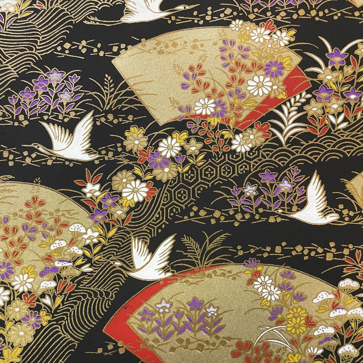 豪華 友禅紙 YUZEN dyeing 金扇と鶴 秋の草花 黒地 大判 菊判 約63x93cm 約63x95㎝