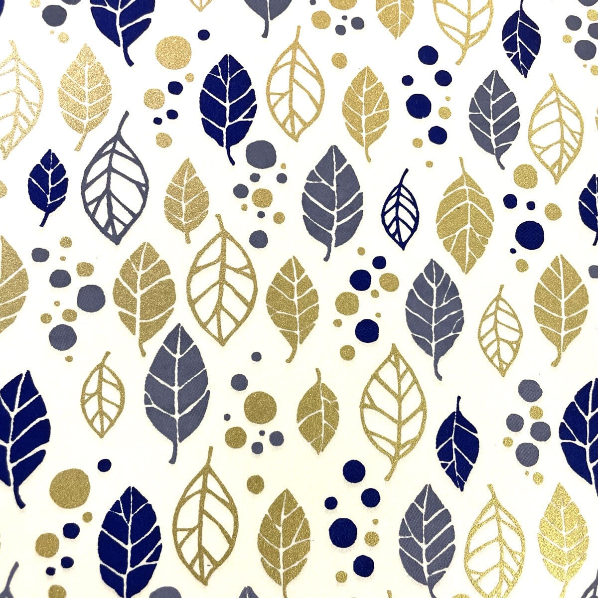 北欧風 友禅紙 YUZEN dyeing 光沢のあるオフホワイト地に金と紺のリーフ柄 葉っぱ柄 大判 約63x93cm 千代紙 64328822