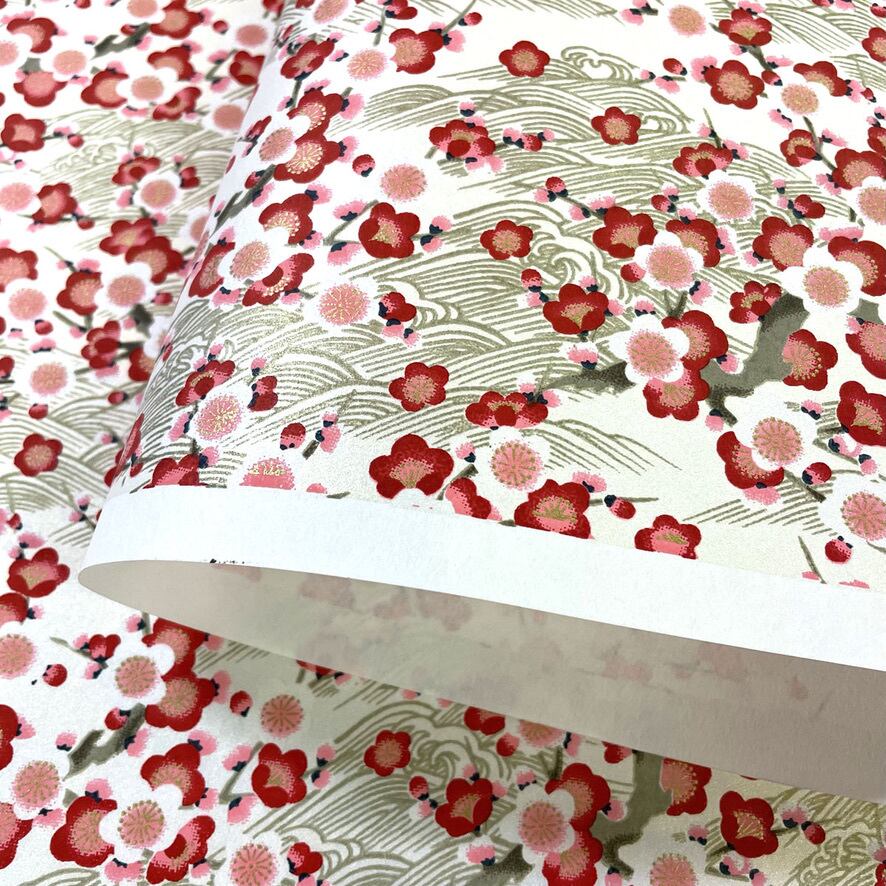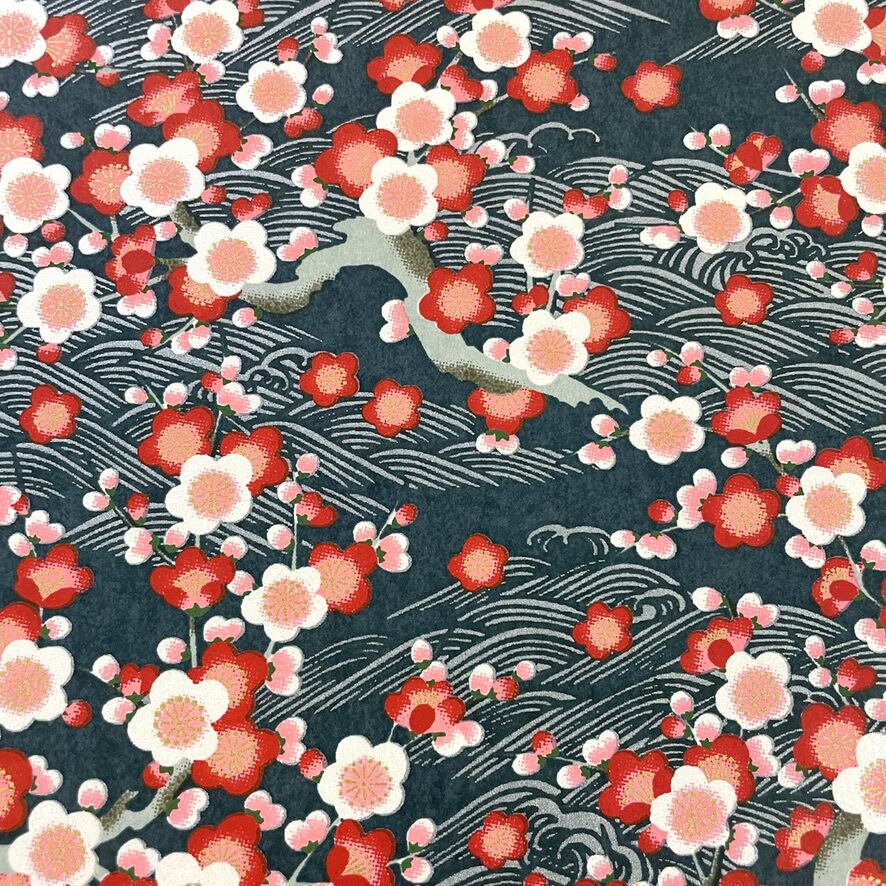 華やかな友禅和紙 波に紅白梅 紺地 白地 大判 菊判 約63x93cm 千代紙 Yuzen dyeing 65660402