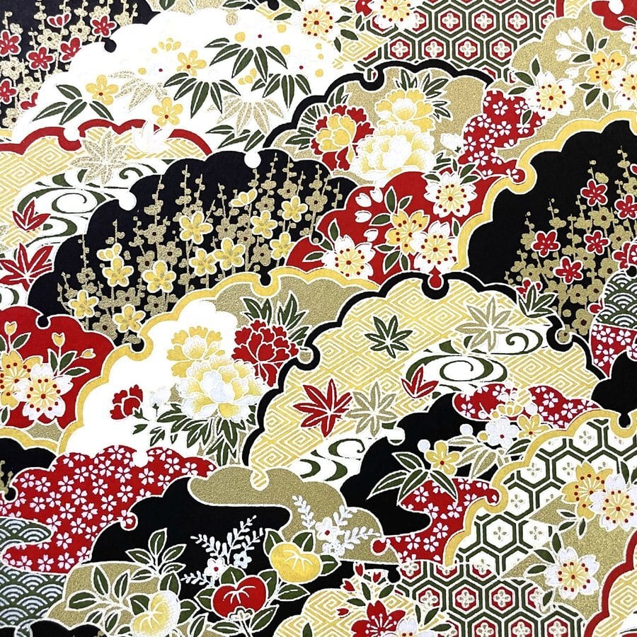 華やかな友禅和紙 古典柄 雪輪文様に桜と紅葉 黒 黄 菊判 大判 約63x93cm?